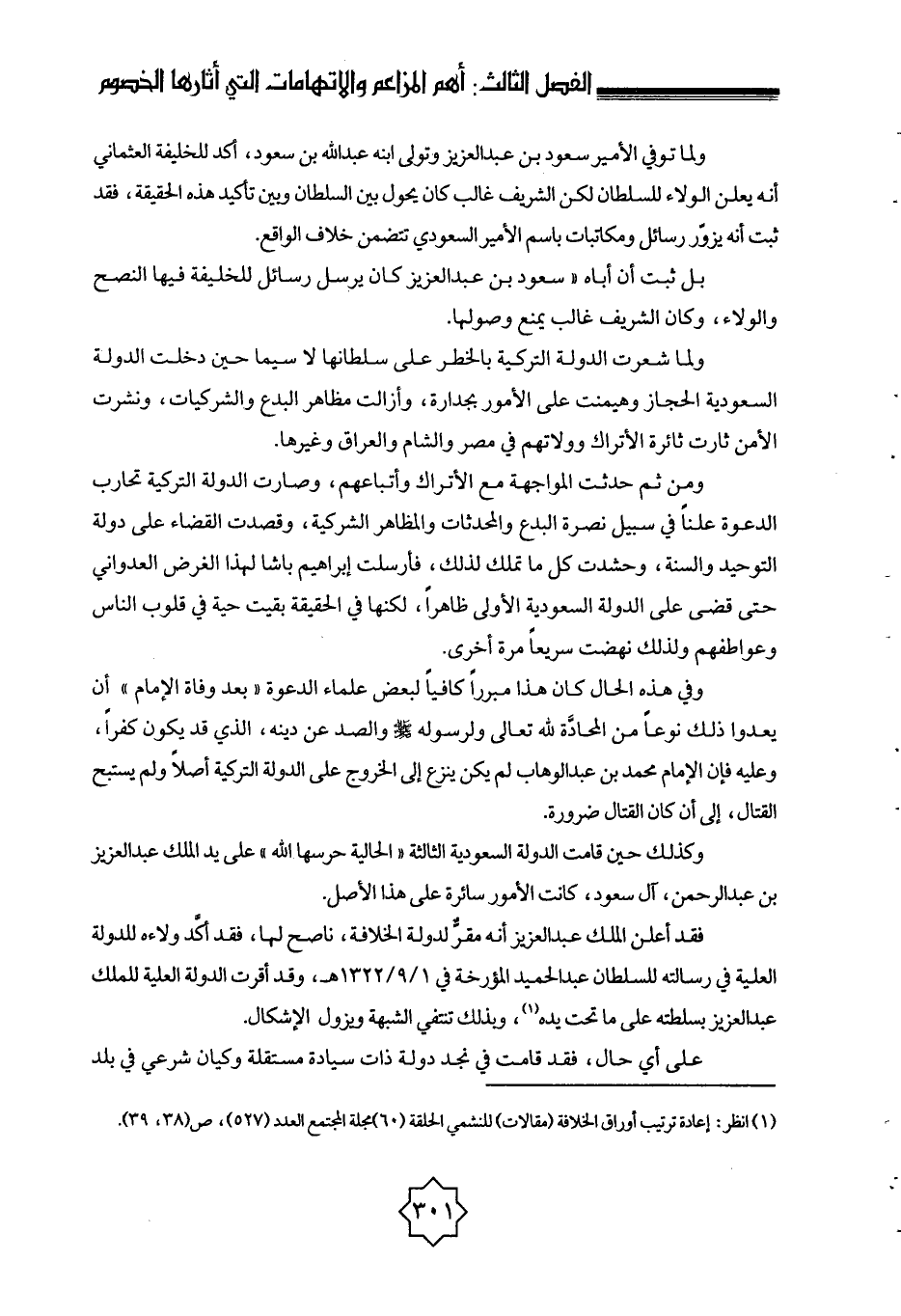 وكذلك حين قامت الدولة السعودية الثالثة - الحالية حرسها الله - على يد الملك عبد العزيز بن عبد الرحمن آل سعود، كانت الأمور سائرة على هذا الأصل، فقد أعلن الملك عبد العزيز أنه مقر لدولة الخلافة، ناصح لها، فقد أكد ولاءه للدولة العلية في رسالته للسلطان عبد الحميد المؤرخة في 1/9\1322 هـ، وقد أقرت الدولة العلية للملك عبد العزيز بسلطته على ما تحت يده (¬1) وبذلك تنتفي الشبهة ويزول الإشكال.