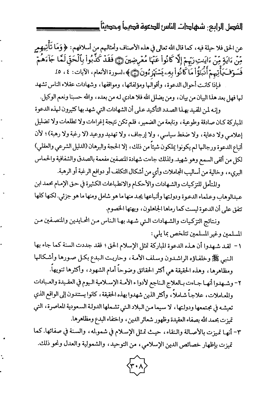 1 - لقد شهدوا أن هذه الدعوة المباركة تمثل الإسلام الحق، فقد جددت السنة كما جاء بها النبي صلى الله عليه وسلم وخلفاؤه الراشدون وسلف الأمة، وحاربت البدع بكل صورها وأشكالها ومظاهرها، وهذه الحقيقة هي أكثر الحقائق وضوحا أمام الشهود، وأكثرها تنويها.