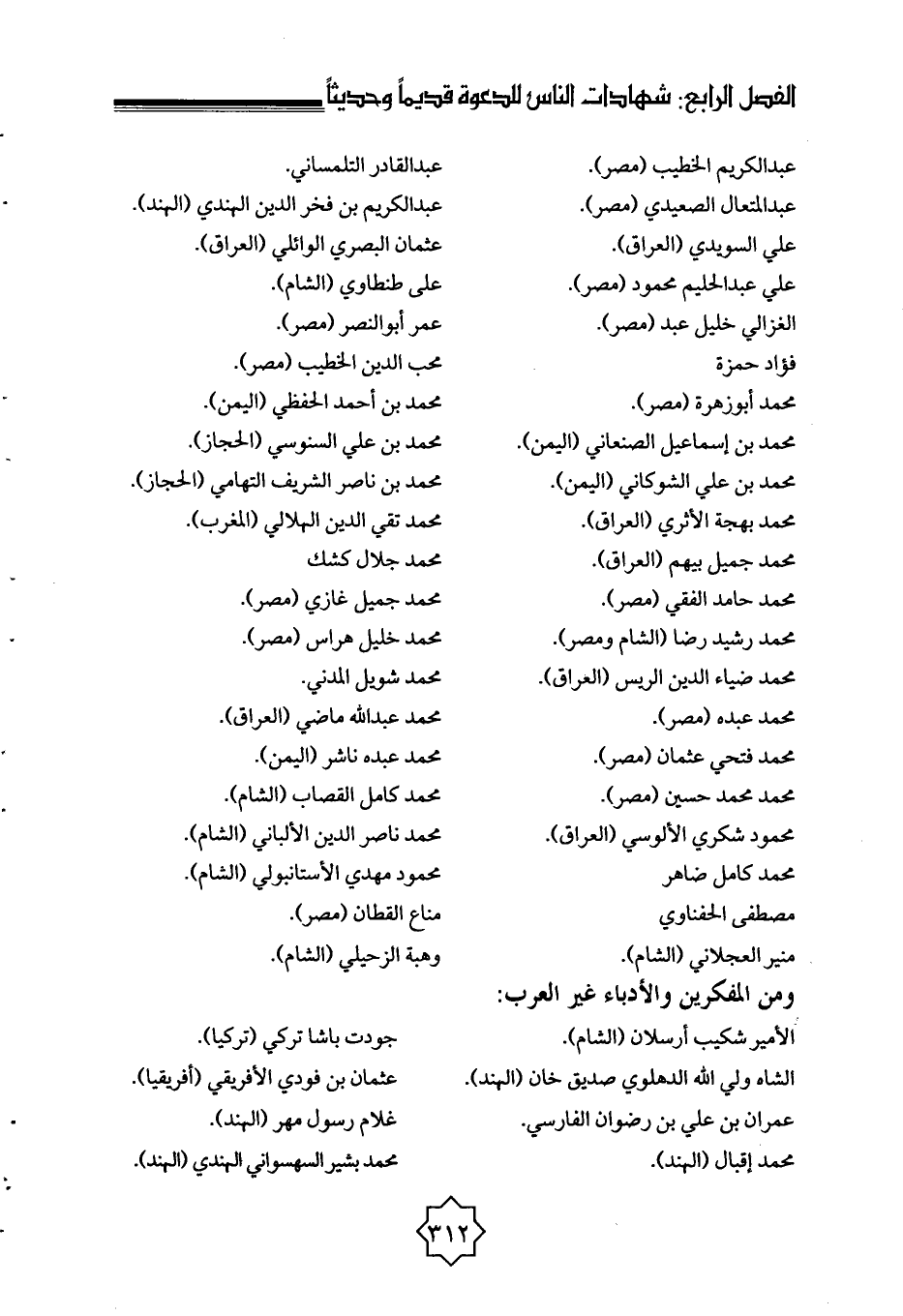 عبد الكريم الخطيب (مصر) . عبد القادر التلمساني. عبد المتعال الصعيدي (مصر) . عبد الكريم بن فخر الدين الهندي (الهند) . علي السويدي (العراق) . عثمان البصري الوائلي (العراق) . علي عبد الحليم محمود (مصر) . علي طنطاوي (الشام) . الغزالي خليل عبد (مصر) . عمر أبو النصر (مصر) . فؤاد حمزة. محب الدين الخطيب (مصر) . محمد أبو زهرة (مصر) . محمد بن أحمد الحفظي (اليمن) . محمد بن إسماعيل الصنعاني (اليمن) . محمد بن علي السنوسي (الحجاز) . محمد بن علي الشوكاني (اليمن) . محمد بن ناصر الشريف التهامي (الحجاز) . محمد بهجة الأثري (العراق) . محمد تقي الدين الهلالي (المغرب) . محمد جميل بيهم (العراق) . محمد جلال كشك. محمد حامد الفقي (مصر) . محمد جميل غازي (مصر) . محمد رشيد رضا (الشام ومصر) . محمد خليل هراس (مصر) . محمد ضياء الدين الريس (العراق) . محمد شويل المدني. محمد عبده (مصر) . محمد عبد الله ماضي (العراق) . محمد فتحي عثمان (مصر) . محمد عبده ناشر (اليمن) . محمد محمد حسين (مصر) . محمد كامل القصاب (الشام) . محمود شكري الألوسي (العراق) . محمد ناصر الدين الألباني (الشام) . محمد كامل ضاهر. محمود مهدي الإستانبولي (الشام) . مصطفى الحفناوي. مناع القطان (مصر) . منير العجلاني (الشام) . وهبة الزحيلي (الشام) .
