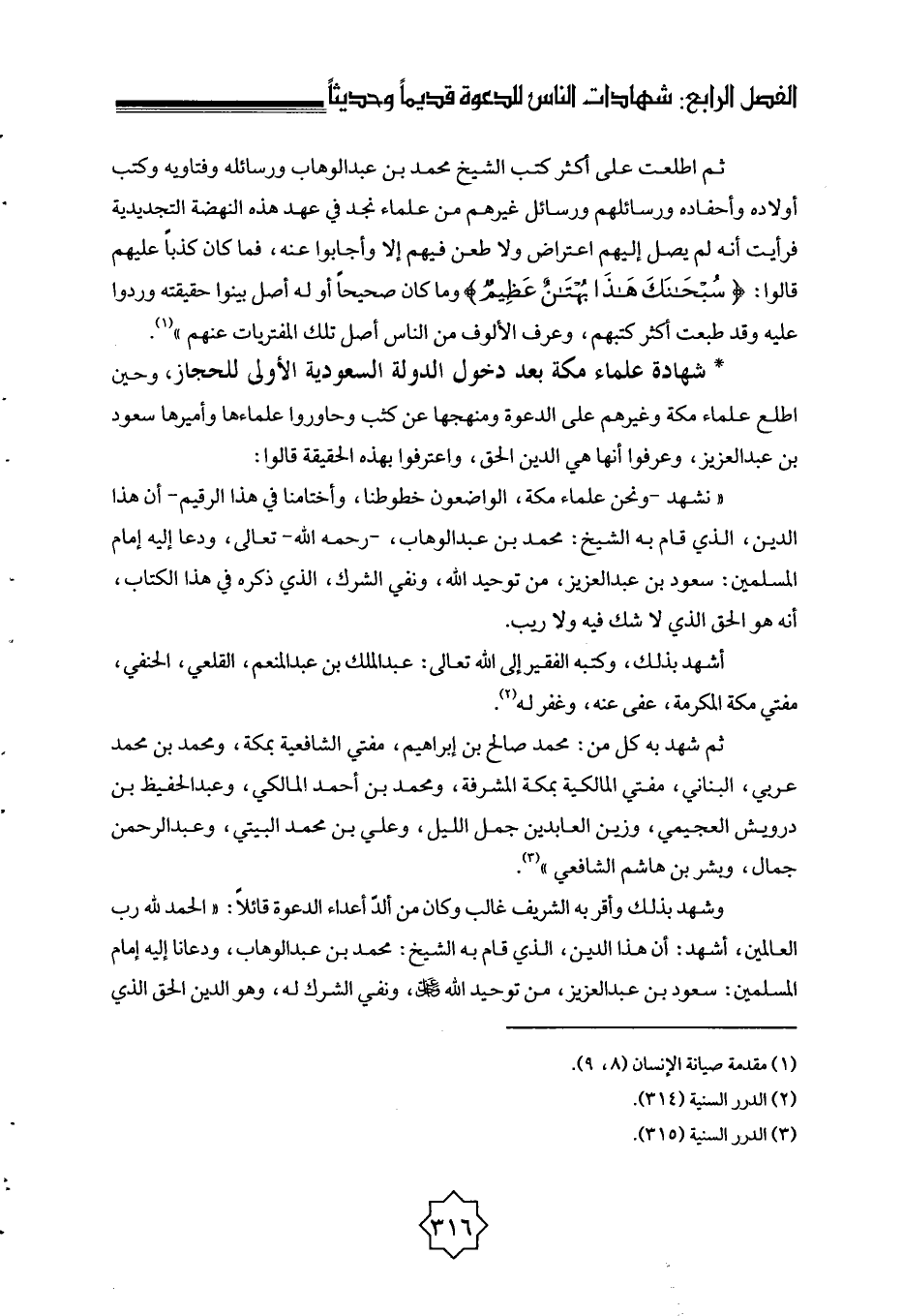 ثم اطلعت على أكثر كتب الشيخ محمد بن عبد الوهاب ورسائله وفتاويه وكتب أولاده وأحفاده ورسائلهم ورسائل غيرهم من علماء نجد في عهد هذه النهضة التجديدية، فرأيت أنه لم يصل إليهم اعتراض ولا طعن فيهم إلا وأجابوا عنه، فما كان كذبا عليهم قالوا: {سُبْحَانَكَ هَذَا بُهْتَانٌ عَظِيمٌ} [النور: 16] ، وما كان صحيحا أو له أصل بينوا حقيقته وردوا عليه، وقد طبعت أكثر كتبهم، وعرف الألوف من الناس أصل تلك المفتريات عنهم " (¬1) .