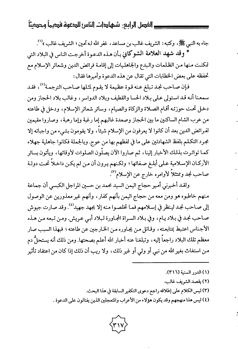 فإن صاحب نجد تبلغ عنه قوة عظيمة لا يقوم لمثلها صاحب الترجمة (¬2) فقد سمعنا أنه قد استولى على بلاد الحسا والقطيف وبلاد الدواسر، وغالب بلاد الحجاز ومن دخل تحت حوزته أقام الصلاة والزكاة والصيام، وسائر شعائر الإسلام، ودخل في طاعته من عرب الشام الساكنين ما بين الحجاز وصعدة غالبهم إما رغبة وإما رهبة، وصاروا مقيمين لفرائض الدين بعد أن كانوا لا يعرفون من الإسلام شيئا، ولا يقومون بشيء من واجباته إلا مجرد التكلم بلفظ الشهادتين على ما في لفظهم بها من عوج، وبالجملة فكانوا جاهلية جهلاء كما تواترت بذلك الأخبار إلينا، ثم صاروا الآن يصلون الصلوات لأوقاتها، ويأتون بسائر الأركان الإسلامية على أبلغ صفاتها، ولكنهم يرون أن من لم يكن داخلا تحت دولة صاحب نجد وممتثلا لأوامره خارج عن الإسلام (¬3) .
