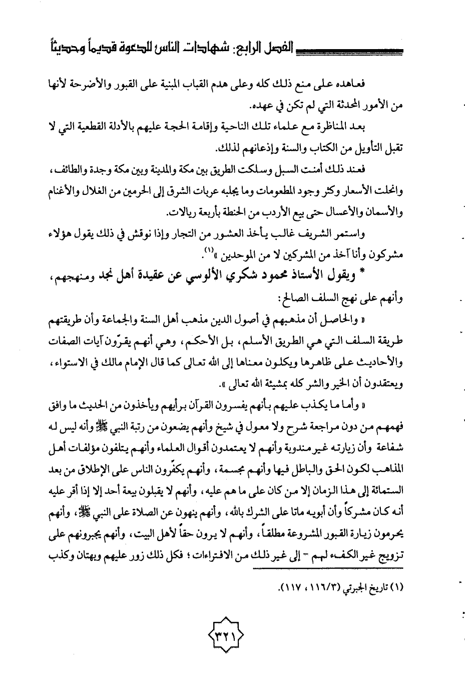 * ويقول الأستاذ محمود شكري الألوسي عن عقيدة أهل نجد ومنهجهم، وأنهم على نهج السلف الصالح:
