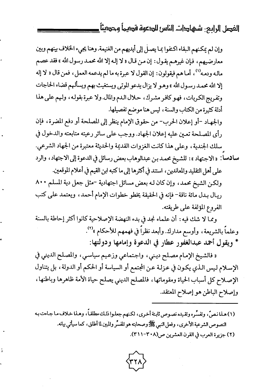 * ويقول أحمد عبد الغفور عطار في الدعوة وإمامها ودولتها: " فالشيخ الإمام مصلح ديني واجتماعي وزعيم سياسي، والمصلح الديني في الإسلام ليس الذي يكون في عزلة عن المجتمع أو السياسة أو الحكم أو الدولة، بل يتناول الإصلاح كل أسباب الحياة ومقوماتها، فالمصلح الديني يصلح حياة الأمة ظاهرها وباطنها، وإصلاح الباطن هو إصلاح المعتقد.