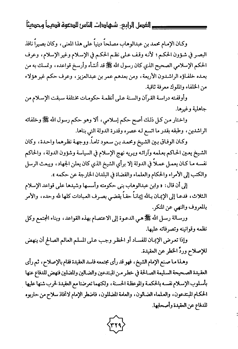 إلى أن قال: " وابن عبد الوهاب بنى حكومته وأسسها وشيدها على قواعد الإسلام الثلاث، فدعا إلى الإيمان بالله إيمانا حقا يقضي بصرف العبادات كلها لله وحده، والأمر بالمعروف والنهي عن المنكر، ورسالة رسل الله صلى الله عليهم وسلم هي الدعوة إلى الاعتصام بهذه القواعد، وبناء المجتمع وكل نظمه وقوانينه وتصرفاته عليها، وإذا تعرض الإيمان للفساد أو الخطر وجب على المسلم العالم الصالح أن ينهض للإصلاح ورد الخطر عن العقيدة.