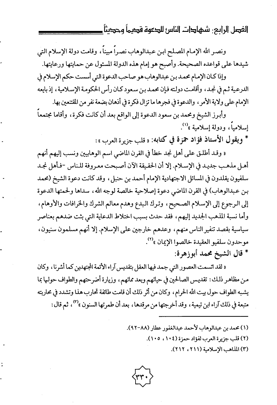 " وقد أطلق على أهل نجد خطأ في القرن الماضي اسم الوهابيين، ونسب إليهم أنهم أهل مذهب جديد في الإسلام، إلا أن الحقيقة الآن أصبحت معروفة للناس، فأهل نجد سلفيون يقلدون في المسائل الاجتهادية الإمام أحمد بن حنبل، وقد كانت دعوة الشيخ (محمد بن عبد الوهاب) في القرن الماضي دعوة إصلاحية خالصة لوجه الله، سداها ولحمتها الدعوة إلى الرجوع إلى الإسلام الصحيح، وترك البدع، وهدم معالم الشرك والخرافات والأوهام، وأما نسبة المذهب الجديد إليهم فقد حدث بسبب اختلاط الدعاية التي بثت ضدهم بعناصر سياسية بقصد تنفير الناس منهم، وعدهم خارجين على الإسلام، إلا أنهم مسلمون سنيون، موحدون سلفيو العقيدة خالصو الإيمان " (¬2) .