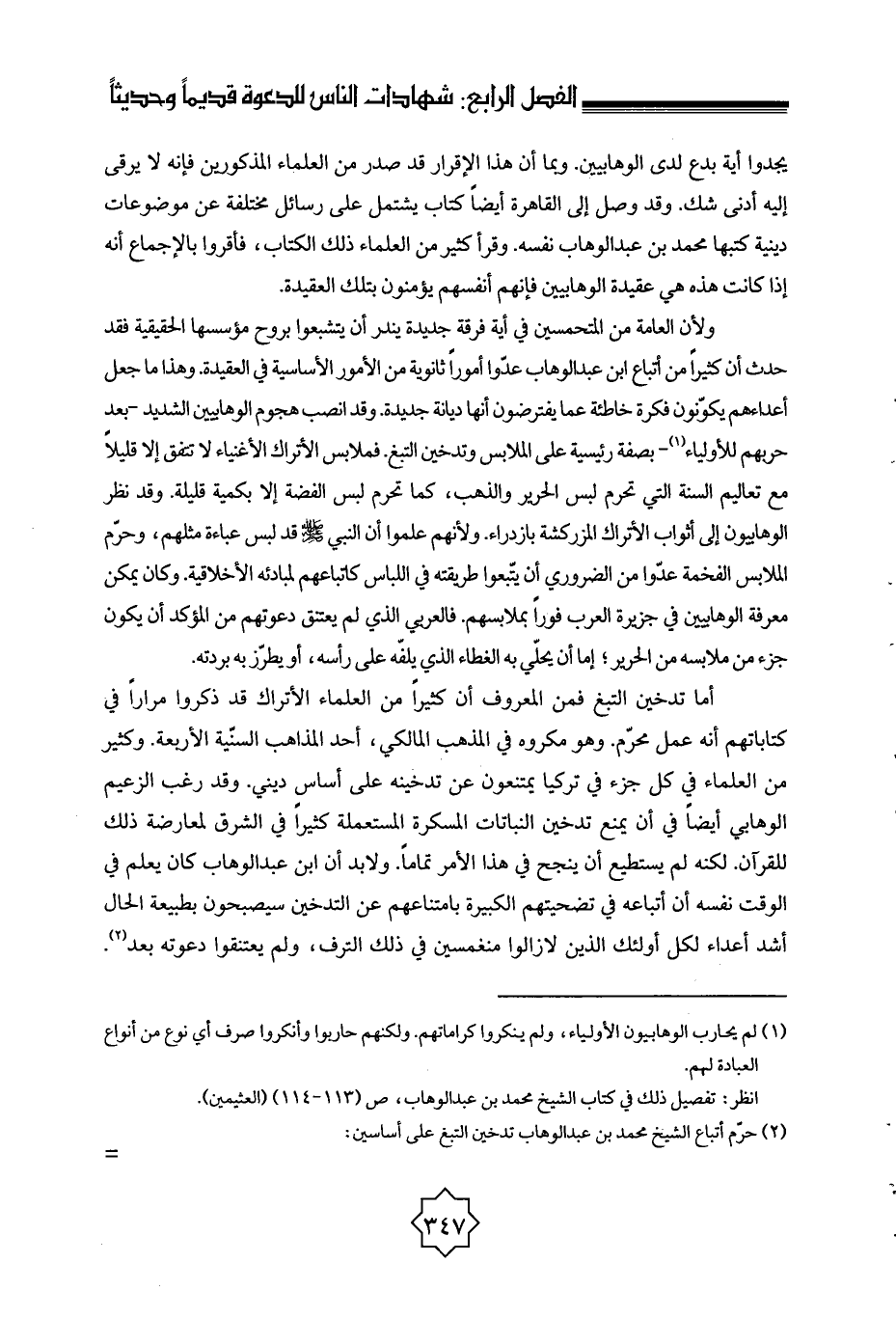 ولأن العامة من المتحمسين في أية فرقة جديدة يندر أن يتشبعوا بروح مؤسسها الحقيقية فقد حدث أن كثيرا من أتباع ابن عبد الوهاب عدوا أمورا ثانوية من الأمور الأساسية في العقيدة، وهذا ما جعل أعداءهم يكونون فكرة خاطئة عما يفترضون أنها ديانة جديدة، وقد انصب هجوم الوهابيين الشديد بعد حربهم للأولياء (¬1) بصفة رئيسية على الملابس وتدخين التبغ، فملابس الأتراك الأغنياء لا تتفق إلا قليلا مع تعاليم السنة التي تحرم لبس الحرير والذهب، كما تحرم لبس الفضة إلا بكمية قليلة، وقد نظر الوهابيون إلى أثواب الأتراك المزركشة بازدراء، ولأنهم علموا أن النبي صلى الله عليه وسلم قد لبس عباءة مثلهم، وحرم الملابس الفخمة، عدوا من الضروري أن يتبعوا طريقته في اللباس كاتباعهم لمبادئه الأخلاقية، وكان يمكن معرفة الوهابيين في جزيرة العرب فورا بملابسهم، فالعربي الذي لم يعتنق دعوتهم من المؤكد أن يكون جزء من ملابسه من الحرير، إما أن يحلي به الغطاء الذي يلفه على رأسه، أو يطرز به بردته.