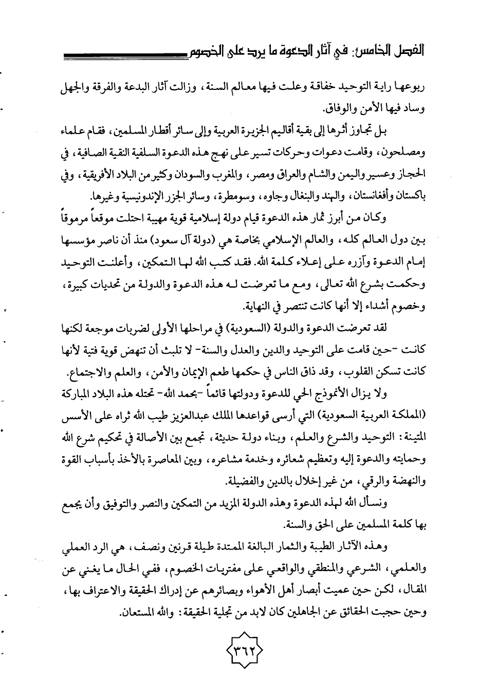 وهذه الآثار الطيبة والثمار البالغة الممتدة طيلة قرنين ونصف هي الرد العملي والعلمي، الشرعي والمنطقي والواقعي على مفتريات الخصوم، ففي الحال ما يغني عن المقال، لكن حين عميت أبصار أهل الأهواء وبصائرهم عن إدراك الحقيقة والاعتراف بها، وحين حجبت الحقائق عن الجاهلين، كان لا بد من تجلية الحقيقة، والله المستعان.