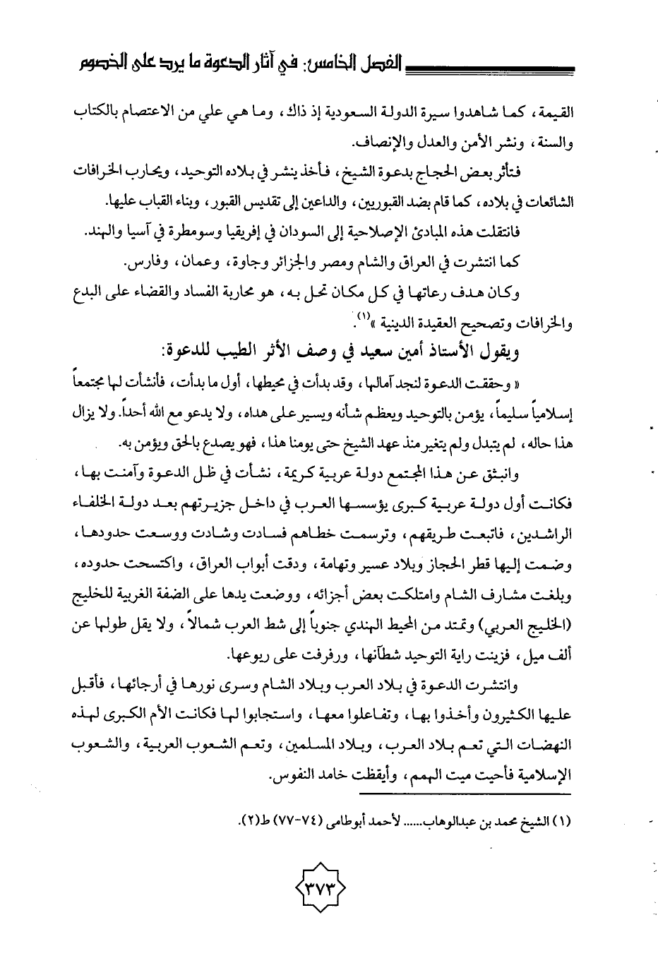 ويقول الأستاذ أمين سعيد في وصف الأثر الطيب للدعوة: " وحققت الدعوة لنجد آمالها، وقد بدأت في محيطها أول ما بدأت، فأنشأت لها مجتمعا إسلاميا سليما، يؤمن بالتوحيد، ويعظم شأنه، ويسير على هداه، ولا يدعو مع الله أحدا، ولا يزال هذا حاله، لم يتبدل ولم يتغير منذ عهد الشيخ حتى يومنا هذا، فهو يصدع بالحق ويؤمن به.