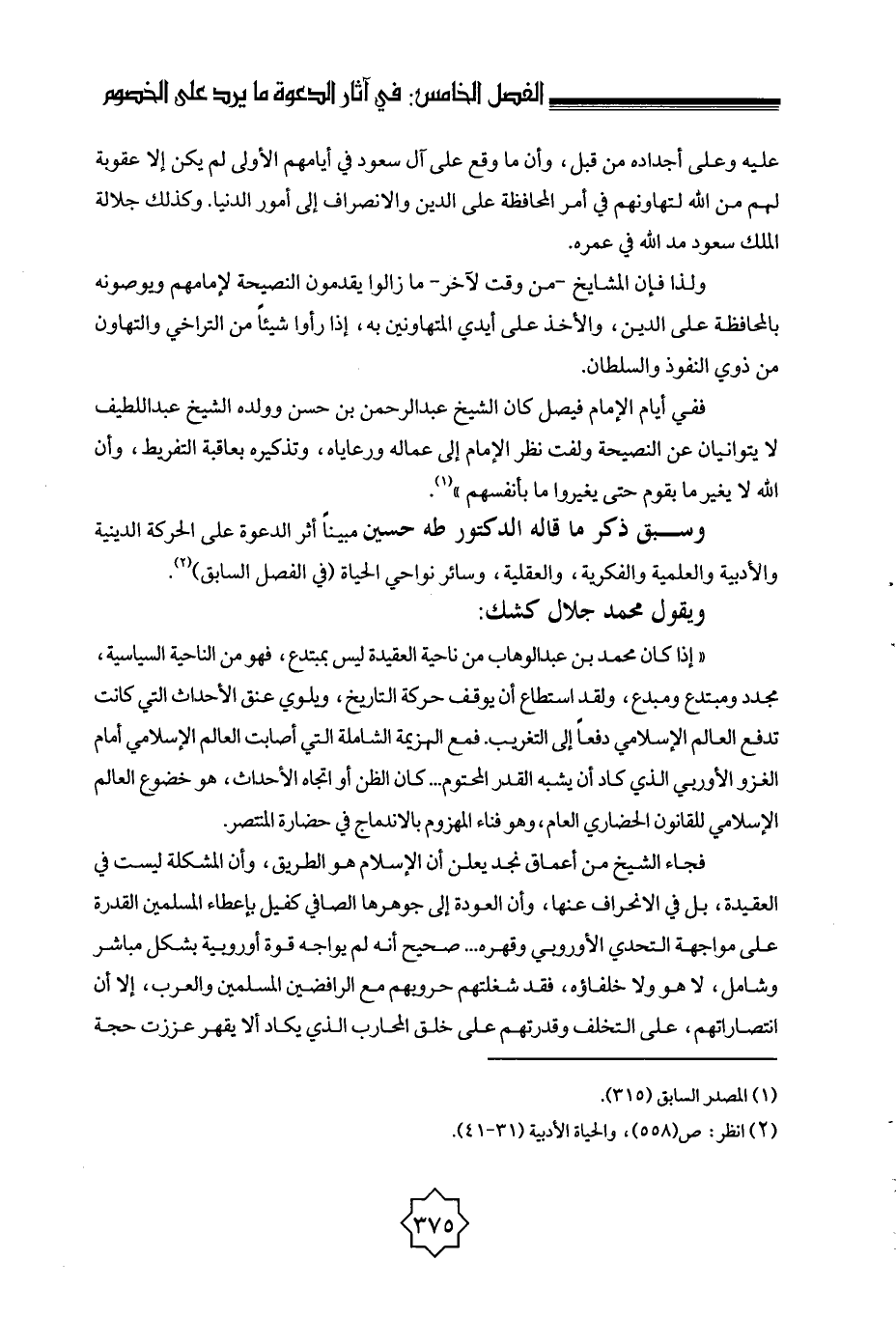 عليه وعلى أجداده من قبل، وأن ما وقع على آل سعود في أيامهم الأولى لم يكن إلا عقوبة لهم من الله لتهاونهم في أمر المحافظة على الدين، والانصراف إلى أمور الدنيا، وكذلك جلالة الملك سعود مد الله في عمره.