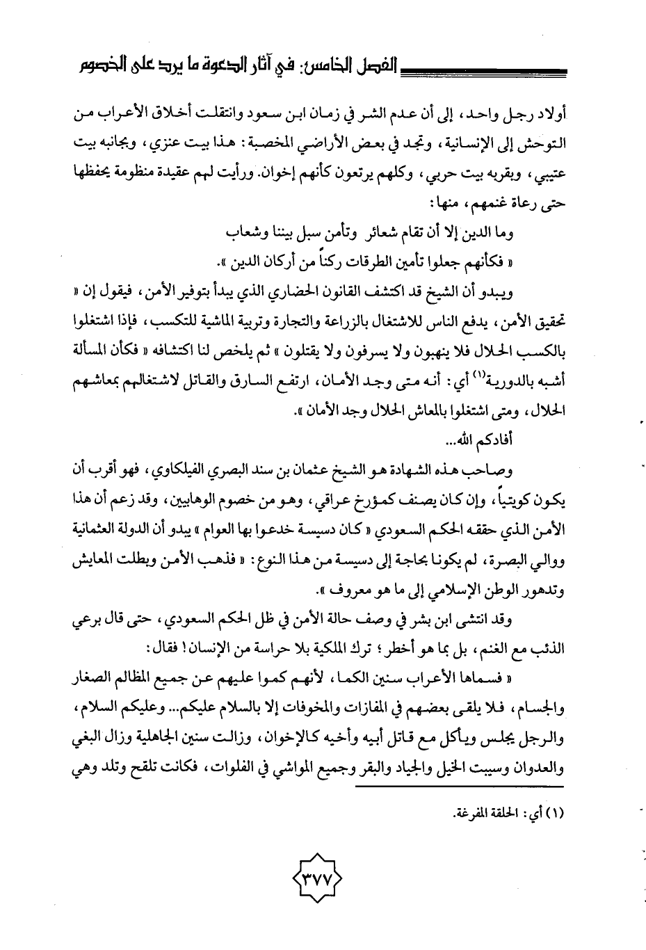 أولاد رجل واحد، إلى أن عدم الشر في زمان ابن سعود، وانتقلت أخلاق الأعراب من التوحش إلى الإنسانية، وتجد في بعض الأراضي المخصبة هذا بيت عنزي، وبجانبه بيت عتيبي، وبقربه بيت حربي، وكلهم يرتعون كأنهم إخوان، ورأيت لهم عقيدة منظومة يحفظها حتى رعاة غنمهم، منها: