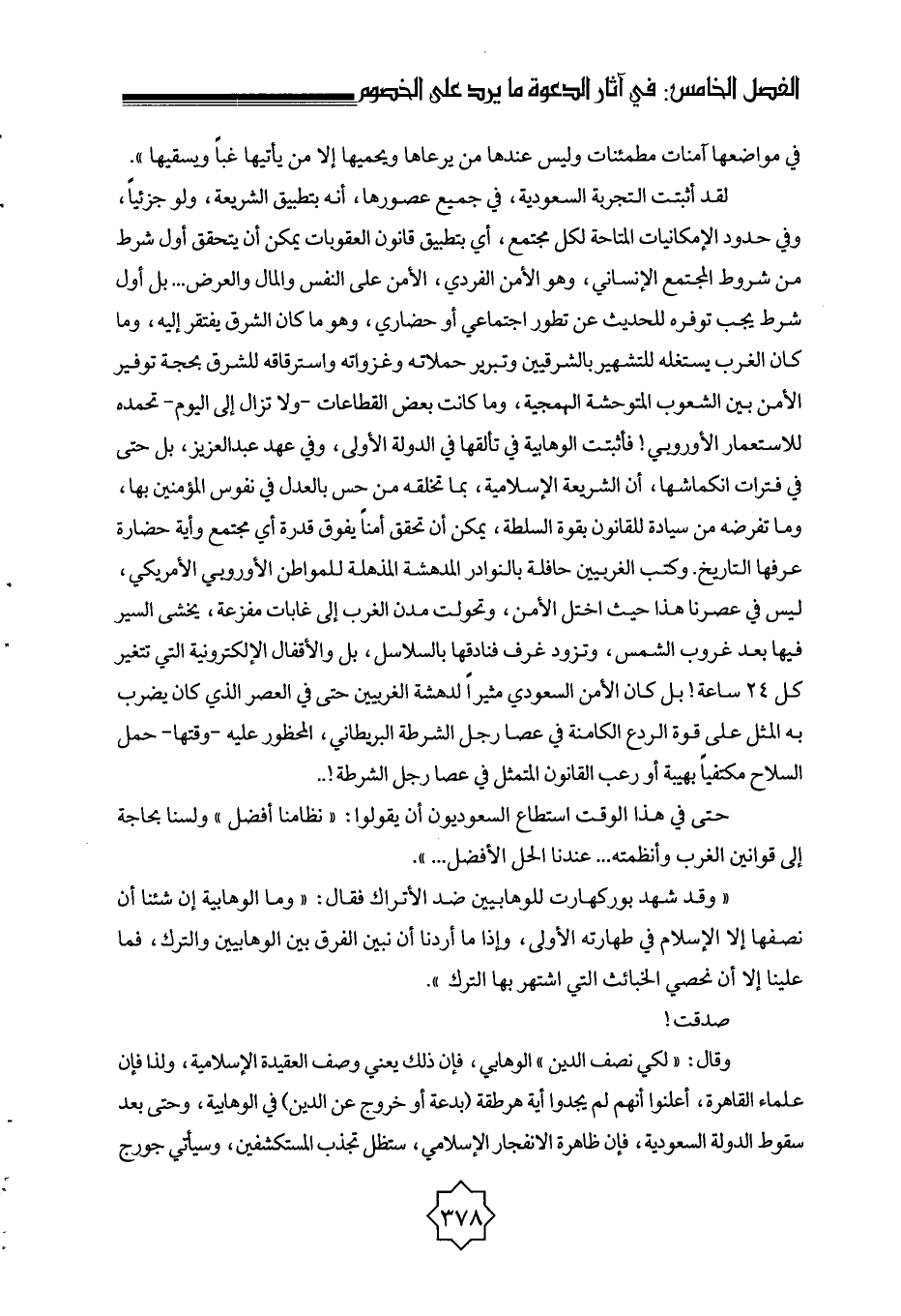 وقال: " لكي نصف الدين " الوهابي فإن ذلك يعني وصف العقيدة الإسلامية، ولذا فإن علماء القاهرة أعلنوا أنهم لم يجدوا أية هرطقة (بدعة أو خروج عن الدين) في الوهابية، وحتى بعد سقوط الدولة السعودية فإن ظاهرة الانفجار الإسلامي ستظل تجذب المستكشفين، وسيأتي جورج