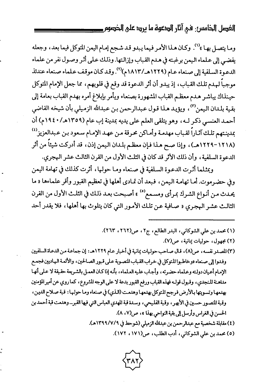 (¬3) المصدر نفسه، ص (8) ، قال صاحب حوليات يمانية في أخبار عام 1229 هـ: إن جماعة من الدعاة السلفيين وفدوا إلى صنعاء " وخاطبوا المتوكل في خراب القباب المنصوبة على قبور الصالحين والأئمة الهاديين، فجمع الإمام أعيان دولته وعلماء حضرته، وأجاب عليه العلماء بأنه إذا كان العمل بالشريعة حقيقة لا على أنها مداهنة للنجدي وقبول قوله، فهذه القباب ورفع القبور بدعة لا على الوجه المشروع، كما روي عن أمير المؤمنين بهدمها وتسويتها بالأرض، فرجح المتوكل بهدمها وهدمت (الذي) في صنعاء وما حولها: قبة صلاح الدين، وقبة المنصور حسين في الأبهر، وقبة الفليحي، وسدة قبة المهدي العباس التي فيها القبر، وهدمت قبة أحمد بن الحسن في الغراس، وأرسل إلى بقية النواحي بهذا "، ص (7، 8) .