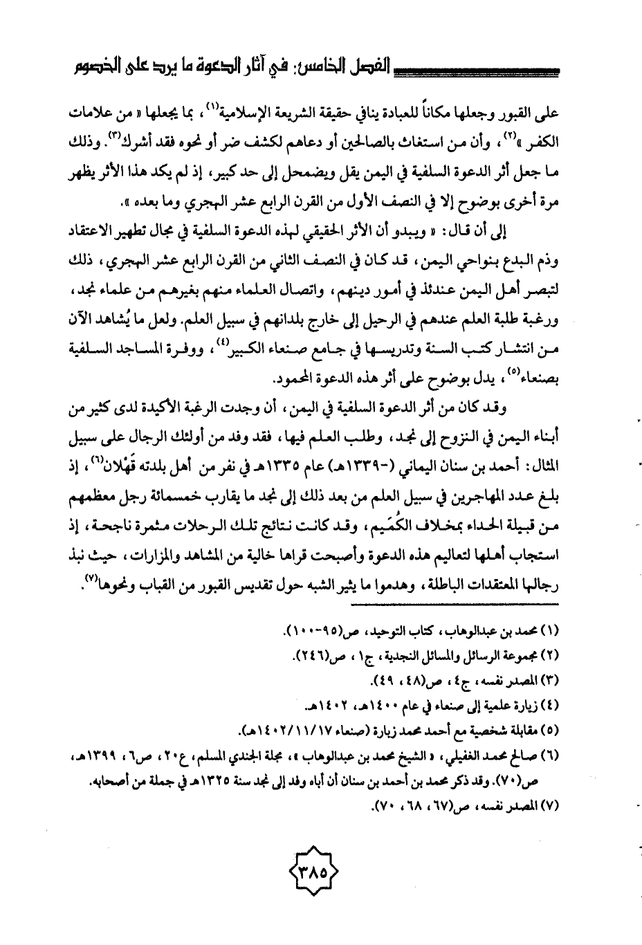 إلى أن قال: «ويبدو أن الأثر الحقيقي لهذه الدعوة السلفية في مجال تطهير الاعتقاد وذم البدع بنواحي اليمن قد كان في النصف الثاني من القرن الرابع عشر الهجري، ذلك لتبصر أهل اليمن عندئذ في أمور دينهم، واتصال العلماء منهم بغيرهم من علماء نجد، ورغبة طلبة العلم عندهم في الرحيل إلى خارج بلدانهم في سبيل العلم. ولعل ما يُشاهد الآن من انتشار كتب السنة وتدريسها في جامع صنعاء الكبير (¬4) ووفرة المساجد السلفية بصنعاء (¬5) يدل بوضوح على أثر هذه الدعوة المحمود.