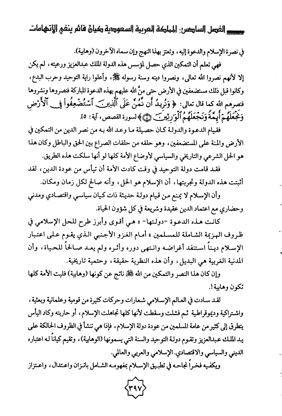لقد سادت في العالم الإسلامي شعارات وحركات كثيرة من قومية وعلمانية وبعثية، واشتراكية وديموقراطية، ثم فشلت وسقطت؛ لأنها كلها تجاهلت الإسلام، أو حاربته، وكاد اليأس يتطرق إلى كثير من عامة المسلمين من عودة دولة الإسلام، فإذا هي تنشأ في الظروف الحالكة على يد الملك عبد العزيز، وتقوم دولة التوحيد والسنة التي يسمونها (الوهابية) ، وتقيم كيانًا له اعتباره الديني والسياسي والاقتصادي. الإسلامي والعربي والعالمي.