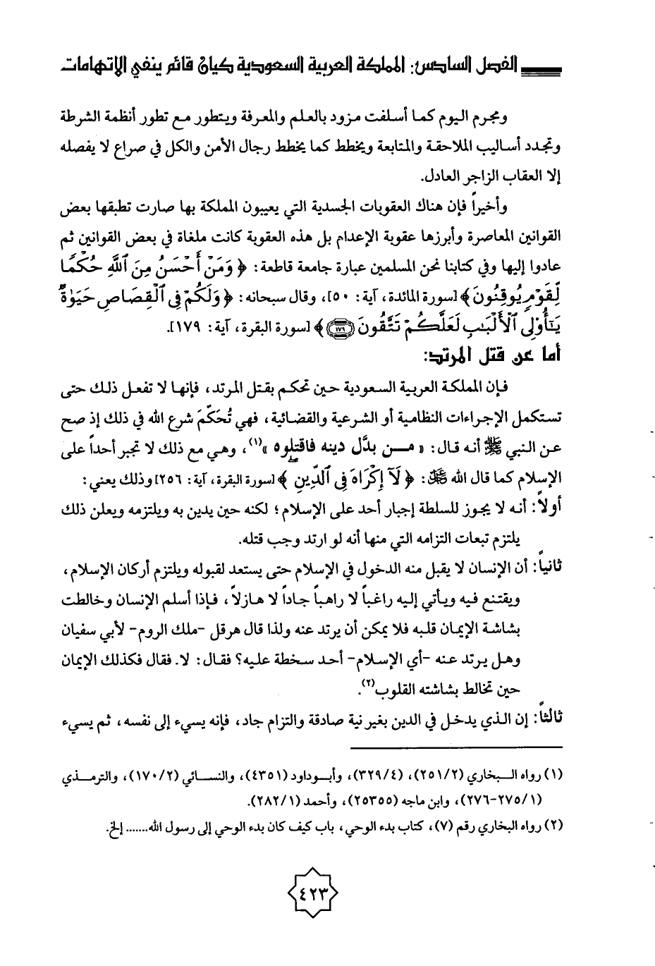 أما عن قتل المرتد: فإن المملكة العربية السعودية حين تحكم بقتل المرتد، فإنها لا تفعل ذلك حتى تستكمل الإجراءات النظامية أو الشرعية والقضائية، فهي تُحَكِّمُ شرع الله في ذلك، إذ صح عن النبي - صلى الله عليه وسلم - أنه قال: «من بدَّل دينه فاقتلوه» (¬1) وهي مع ذلك لا تجبر أحدًا على الإسلام كما قال الله - عز وجل -: {لَا إِكْرَاهَ فِي الدِّينِ} [البقرة: 256] [سورة البقرة، آية: 256] وذلك يعني: