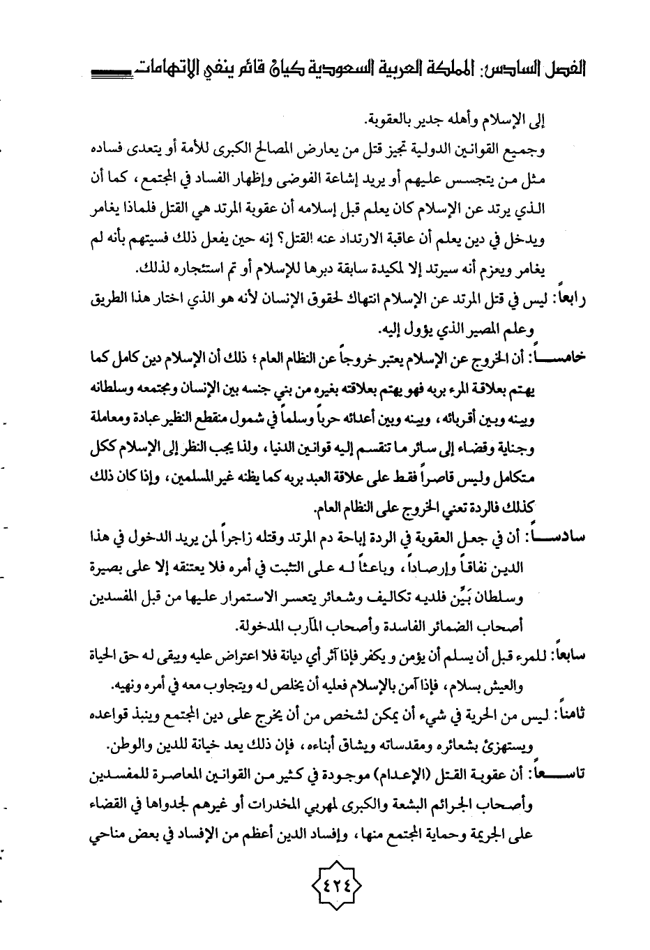 خامسًا: أن الخروج عن الإسلام يعتبر خروجًا عن النظام العام؛ ذلك أن الإسلام دين كامل، كما يهتم بعلاقة المرء بربه فهو يهتم بعلاقته بغيره من بني جنسه بين الإنسان ومجتمعه وسلطانه، وبينه وبين أقربائه، وبينه وبين أعدائه حربًا وسلمًا في شمول منقطع النظير عبادة ومعاملة وجناية وقضاء، إلى سائر ما تنقسم إليه قوانين الدنيا، ولذا يجب النظر إلى الإسلام ككل متكامل وليس قاصرًا فقط على علاقة العبد بربه كما يظنه غير المسلمين، وإذا كان ذلك كذلك فالردة تعني الخروج على النظام العام.