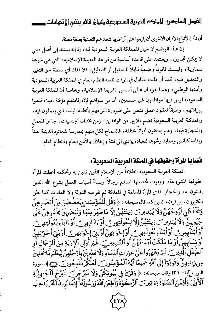 قضايا المرأة وحقوقها في المملكة العربية السعودية: المملكة العربية السعودية انطلاقًا من الإسلام الذي تدين به وتحكمه أعطت المرأة حقوقها المشروعة، ووفرت لمجتمعها المسلم رجالًا ونساءً أسباب العمل بشرع الله الذي يدينون به، والحجاب لدى المرأة المسلمة في المملكة لم تفرضه الدولة ولا العادات كما يظن الكثيرون، بل فرضه الدين كما قال سبحانه: {وَقُلْ لِلْمُؤْمِنَاتِ يَغْضُضْنَ مِنْ أَبْصَارِهِنَّ وَيَحْفَظْنَ فُرُوجَهُنَّ وَلَا يُبْدِينَ زِينَتَهُنَّ إِلَّا مَا ظَهَرَ مِنْهَا وَلْيَضْرِبْنَ بِخُمُرِهِنَّ عَلَى جُيُوبِهِنَّ وَلَا يُبْدِينَ زِينَتَهُنَّ إِلَّا لِبُعُولَتِهِنَّ أَوْ آبَائِهِنَّ أَوْ آبَاءِ بُعُولَتِهِنَّ أَوْ أَبْنَائِهِنَّ أَوْ أَبْنَاءِ بُعُولَتِهِنَّ أَوْ إِخْوَانِهِنَّ أَوْ بَنِي إِخْوَانِهِنَّ أَوْ بَنِي أَخَوَاتِهِنَّ أَوْ نِسَائِهِنَّ أَوْ مَا مَلَكَتْ أَيْمَانُهُنَّ أَوِ التَّابِعِينَ غَيْرِ أُولِي الْإِرْبَةِ مِنَ الرِّجَالِ أَوِ الطِّفْلِ الَّذِينَ لَمْ يَظْهَرُوا عَلَى عَوْرَاتِ النِّسَاءِ وَلَا يَضْرِبْنَ بِأَرْجُلِهِنَّ لِيُعْلَمَ مَا يُخْفِينَ مِنْ زِينَتِهِنَّ وَتُوبُوا إِلَى اللَّهِ جَمِيعًا أَيُّهَا الْمُؤْمِنُونَ لَعَلَّكُمْ تُفْلِحُونَ} [النور: 31] [سورة النور، آية: 31] وقال سبحانه: {وَقَرْنَ فِي بُيُوتِكُنَّ وَلَا تَبَرَّجْنَ تَبَرُّجَ الْجَاهِلِيَّةِ الْأُولَى وَأَقِمْنَ الصَّلَاةَ وآتِينَ الزَّكَاةَ وَأَطِعْنَ اللَّهَ وَرَسُولَهُ إِنَّمَا يُرِيدُ اللَّهُ لِيُذْهِبَ عَنْكُمُ الرِّجْسَ أَهْلَ الْبَيْتِ وَيُطَهِّرَكُمْ تَطْهِيرًا} [الأحزاب: 33] [سورة الأحزاب، آية: 33] .