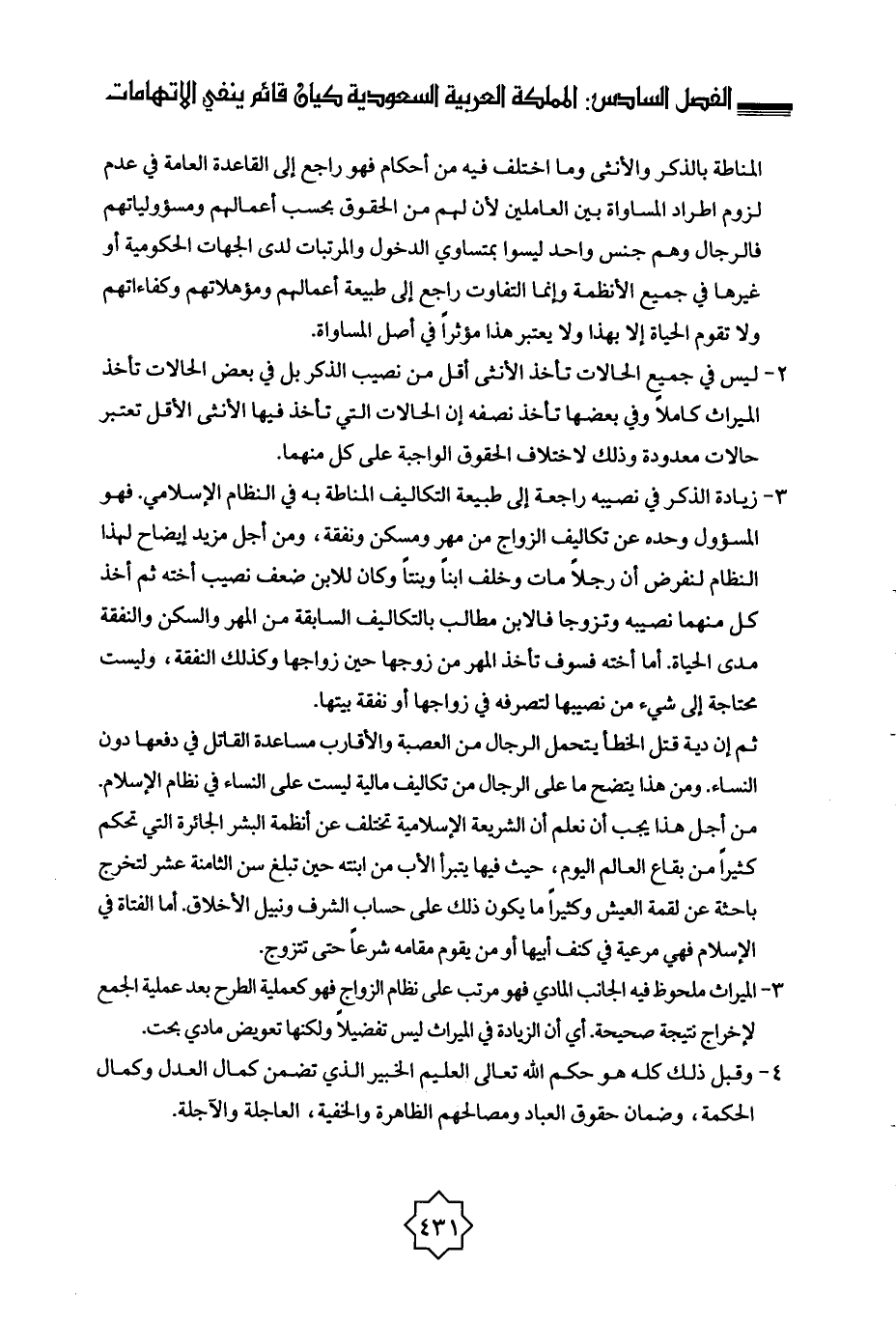المناطة بالذكر والأنثى، وما اختلف فيه من أحكام فهو راجع إلى القاعدة العامة في عدم لزوم اطراد المساواة بين العاملين؛ لأن لهم من الحقوق بحسب أعمالهم ومسؤولياتهم، فالرجال وهم جنس واحد ليسوا بمتساوي الدخول والمرتبات لدى الجهات الحكومية أو غيرها في جميع الأنظمة، وإنما التفاوت راجع إلى طبيعة أعمالهم ومؤهلاتهم وكفاءاتهم، ولا تقوم الحياة إلا بهذا، ولا يعتبر هذا مؤثرًا في أصل المساواة.