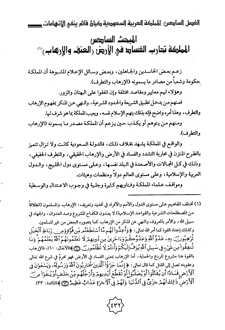 المملكة تحارب الفساد في الأرض (العنف والإرهاب) (¬1) زعم بعض الحاسدين والجاهلين، وبعض وسائل الإعلام المشبوهة أن المملكة حكومة وشعبًا من مصادر ما يسمونه (الإرهاب والتطرف) .