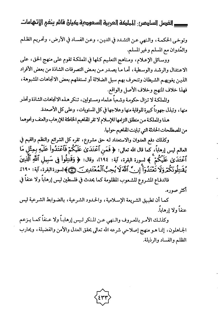 هذا والمملكة من منطلق التزامها للإسلام لا تقر المفاهيم الخاطئة للإرهاب والعنف ونحوهما من المصطلحات الحادثة التي تباينت المفاهيم حولها.