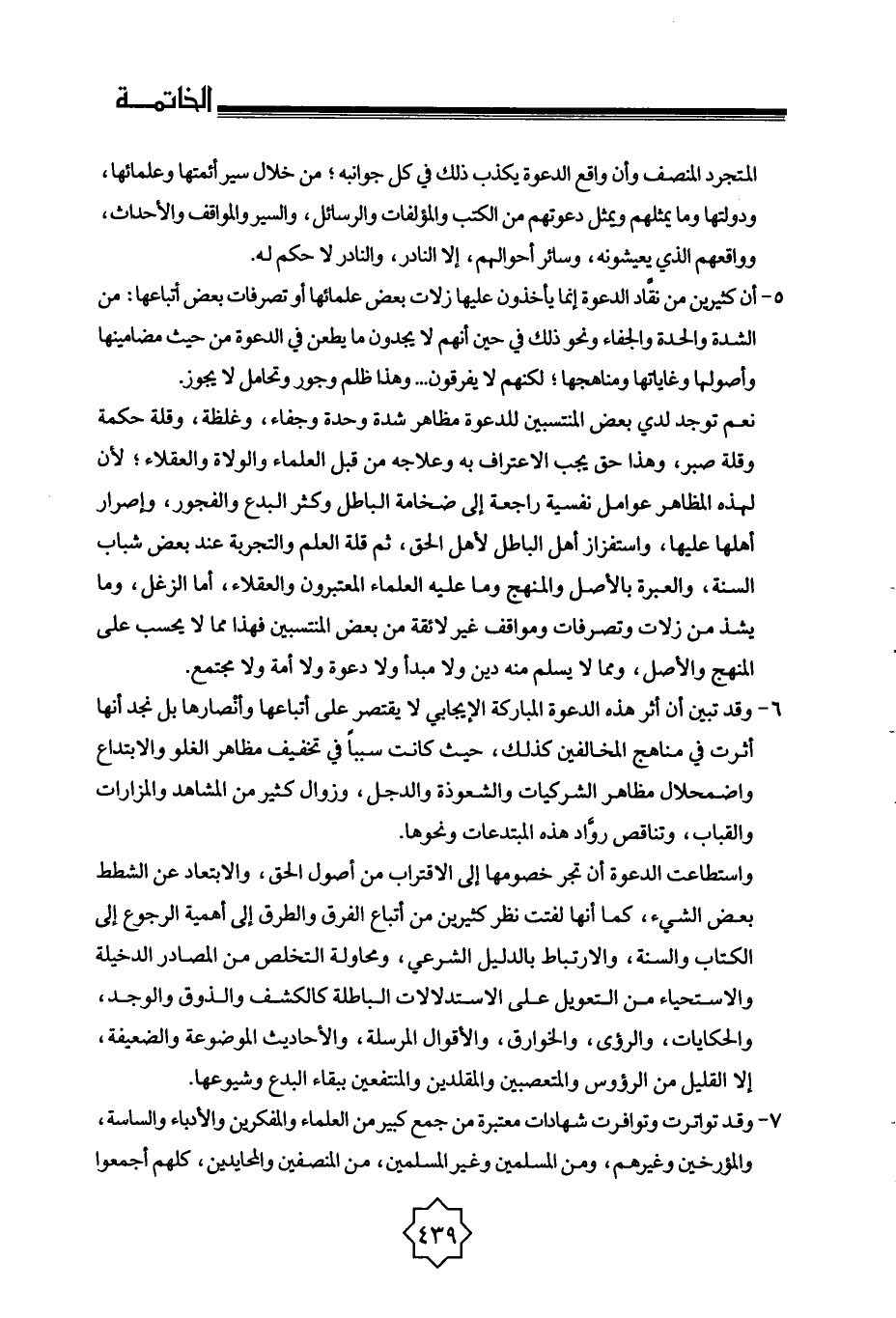 6 - وقد تبين أن أثر هذه الدعوة المباركة الإيجابي لا يقتصر على أتباعها وأنْصارها، بل نجد أنها أثرت في مناهج المخالفين كذلك، حيث كانت سببًا في تخفيف مظاهر الغلو والابتداع واضمحلال مظاهر الشركيات والشعوذة والدجل، وزوال كثير من المشاهد والمزارات والقباب، وتناقص روَّاد هذه المبتدعات ونحوها.