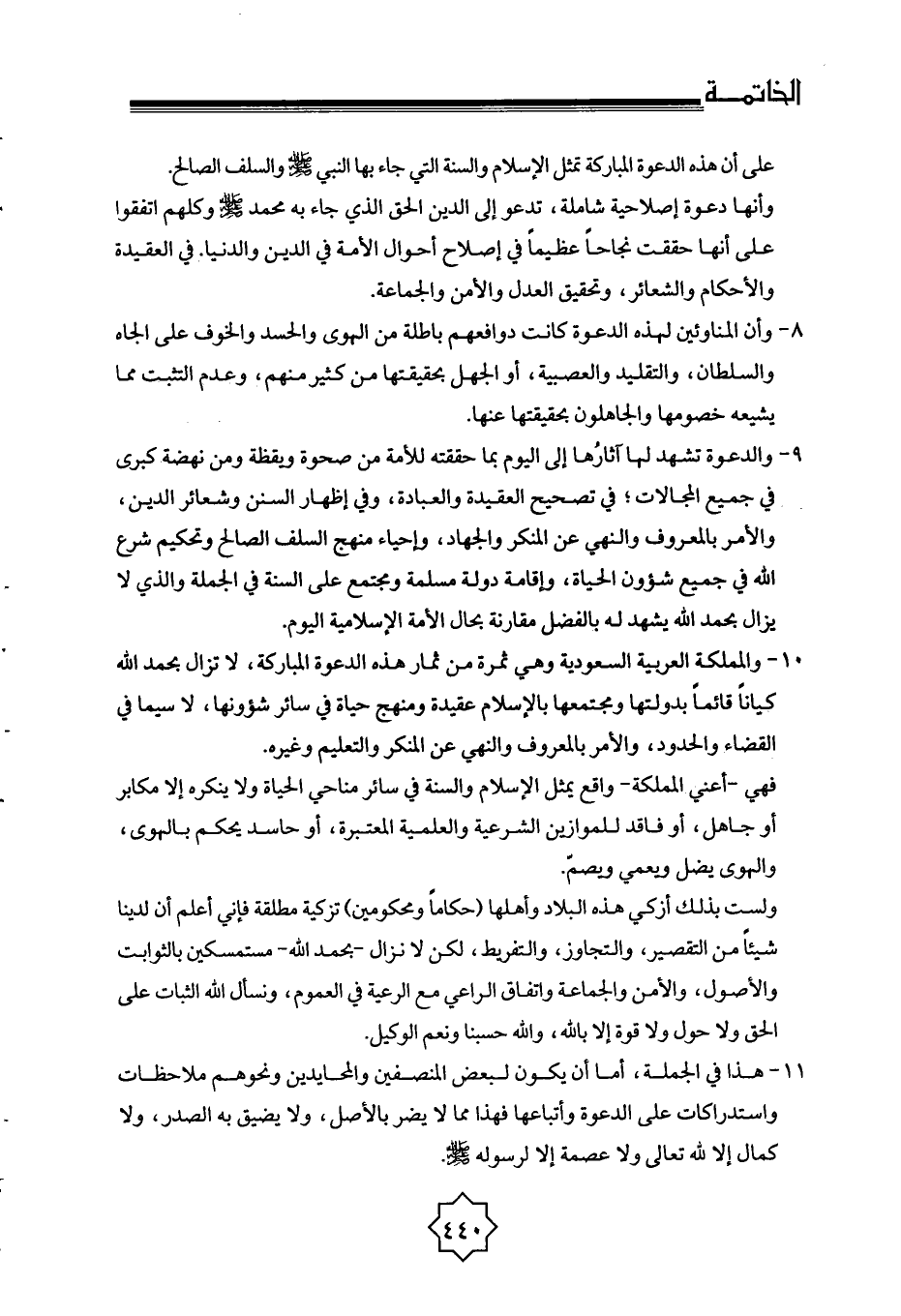 10 - والمملكة العربية السعودية وهي ثمرة من ثمار هذه الدعوة المباركة، لا تزال بحمد الله كيانًا قائمًا بدولتها ومجتمعها بالإسلام عقيدة ومنهج حياة في سائر شؤونها، لا سيما في القضاء والحدود، والأمر بالمعروف والنهي عن المنكر والتعليم وغيره.