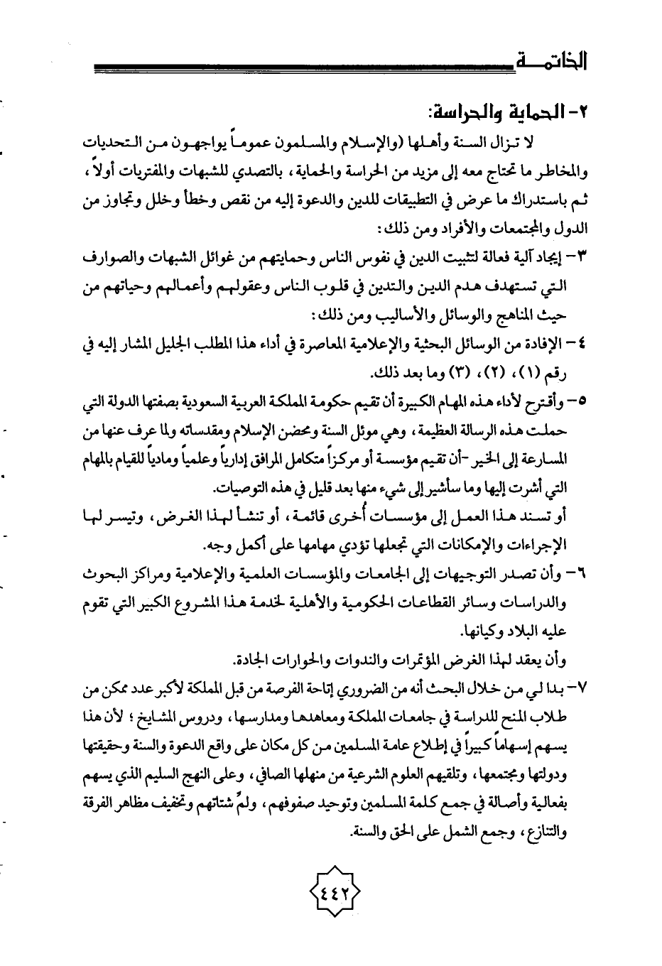 5 - وأقترح لأداء هذه المهام الكبيرة أن تقيم حكومة المملكة العربية السعودية بصفتها الدولة التي حملت هذه الرسالة العظيمة، وهي موئل السنة ومحضن الإسلام ومقدساته ولما عرف عنها من المسارعة إلى الخير أن تقيم مؤسسة أو مركزًا متكامل المرافق إداريًا وعلميًا وماديًا للقيام بالمهام التي أشرت إليها وما سأشير إلى شيء منها بعد قليل في هذه التوصيات.