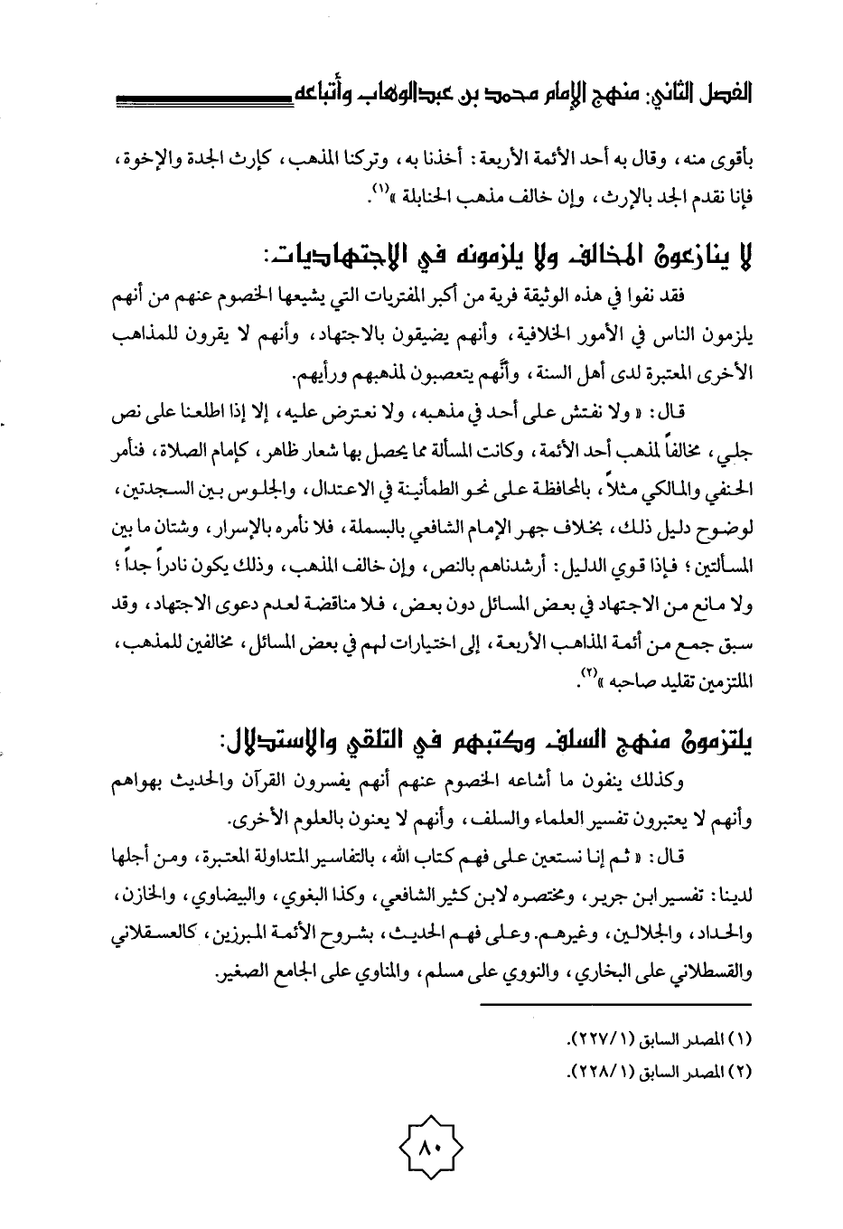 يلتزمون منهج السلف وكتبهم في التلقي والاستدلال: وكذلك ينفون ما أشاعه الخصوم عنهم أنهم يفسرون القرآن والحديث بهواهم وأنهم لا يعتبرون تفسير العلماء والسلف، وأنهم لا يعنون بالعلوم الأخرى.