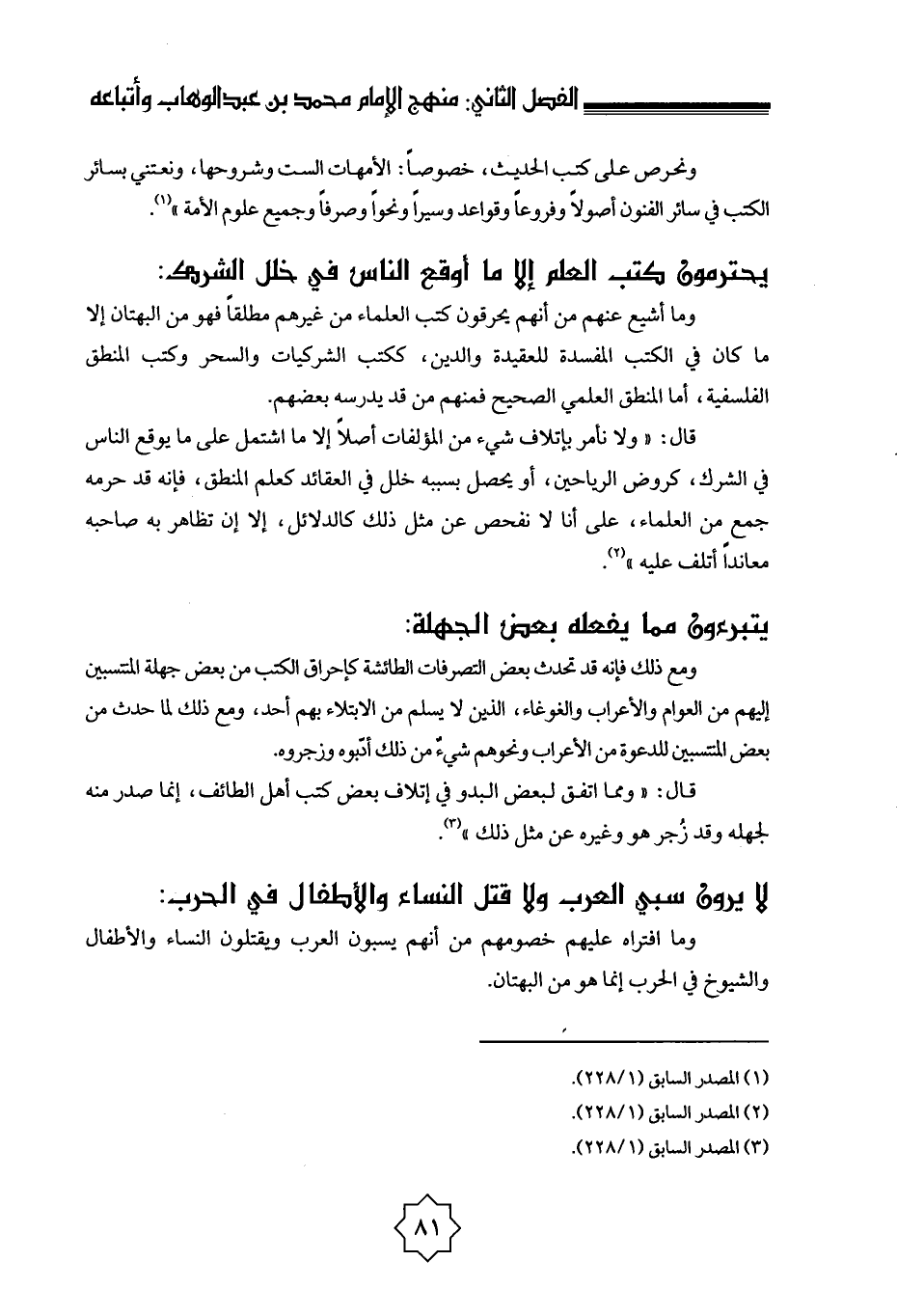 يحترمون كتب العلم إلا ما أوقع الناس في خلل الشرك: وما أشيع عنهم من أنهم يحرقون كتب العلماء من غيرهم مطلقًا فهو من البهتان إلا ما كان في الكتب المفسدة للعقيدة والدين، ككتب الشركيات والسحر وكتب المنطق الفلسفية، أما المنطق العلمي الصحيح فمنهم من قد يدرسه بعضهم.