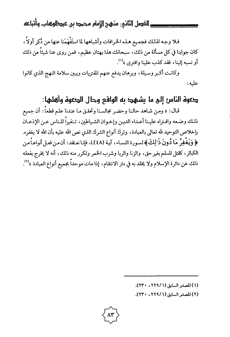 دعوة الناس إلى ما يشهد به الواقع وحال الدعوة وأهلها: قال: «ومن شاهد حالنا وحضر مجالسنا وتحقق ما عندنا علم قطعًا: أن جميع ذلك وضعه وافتراه علينا أعداء الدين وإخوان الشياطين، تنفيرًا للناس عن الإذعان بإخلاص التوحيد لله تعالى بالعبادة، وترك أنواع الشرك الذي نص الله عليه بأن الله لا يغفره. {وَيَغْفِرُ مَا دُونَ ذَلِكَ} [النساء: 48] [سورة النساء، آية: 48.] ، فإنا نعتقد: أن من فعل أنواعًا من الكبائر، كقتل المسلم بغير حق، والزنا والربا وشرب الخمر وتكرر منه ذلك، أنه لا يخرج بفعله ذلك عن دائرة الإسلام ولا يخلد به في دار الانتقام، إذا مات موحدًا بجميع أنواع العبادة» (¬2) .