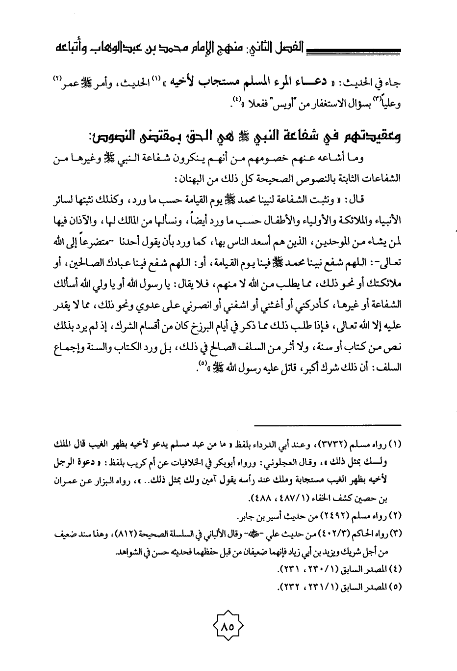 وعقيدتهم في شفاعة النبي - صلى الله عليه وسلم - هي الحق بمقتضى النصوص: وما أشاعه عنهم خصومهم من أنهم ينكرون شفاعة النبي - صلى الله عليه وسلم - وغيرها من الشفاعات الثابتة بالنصوص الصحيحة كل ذلك من البهتان: