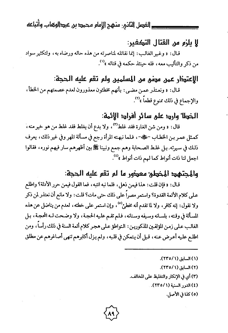 والمجتهد المخطئ معذور ما لم تقم عليه الحجة: قال: «فإن قلت: هذا فيمن ذهل، فلما نبه انتبه، فما القول فيمن حرر الأدلة؟ واطلع على كلام الأئمة القدوة؟ واستمر مصرًا على ذلك حتى مات؟ قلت: ولا مانع أن نعتذر لمن ذكر ولا نقول: إنه كافر، ولا لما تقدم أنه مخطئ (¬5) وإن استمر على خطئه، لعدم من يناضل عن هذه المسألة في وقته، بلسانه وسيفه وسنانه، فلم تقم عليه الحجة، ولا وضحت له المحجة، بل الغالب على زمن المؤلفين المذكورين: التواطؤ على هجر كلام أئمة السنة في ذلك رأسًا، ومن اطلع عليه أعرض عنه، قبل أن يتمكن في قلبه، ولم يزل أكابرهم تنهى أصاغرهم عن مطلق