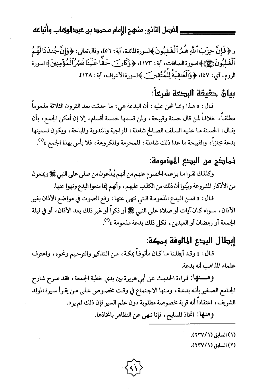 نماذج من البدع المذمومة: وكذلك نفوا ما يزعمه الخصوم عنهم من أنهم يُبدِّعون من صلى على النبي - صلى الله عليه وسلم - ويمنعون من الأذكار المشروعة وبيّنوا أن ذلك من الكذب عليهم، وأنهم إنما منعوا البدع ونهوا عنها.