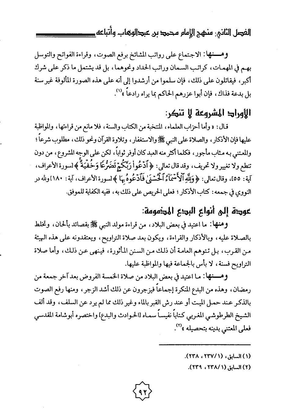 الأوراد المشروعة لا تنكر: قال: «وأما أحزاب العلماء، المنتخبة من الكتاب والسنة، فلا مانع من قراءتها، والمواظبة عليها فإن الأذكار، والصلاة على النبي - صلى الله عليه وسلم - والاستغفار، وتلاوة القرآن ونحو ذلك مطلوب شرعًا؛ والمعتني به مثاب مأجور، فكلما أكثر منه العبد كان أوفر ثوابًا، لكن على الوجه المشروع، من دون تنطع ولا تغيير ولا تحريف، وقد قال تعالى: {ادْعُوا رَبَّكُمْ تَضَرُّعًا وَخُفْيَةً} [الأعراف: 55] [سورة الأعراف، آية: 55] ، وقال تعالى: {وَلِلَّهِ الْأَسْمَاءُ الْحُسْنَى فَادْعُوهُ بِهَا} [الأعراف: 180] [سورة الأعراف، آية: 180] ولله در النووي في جمعه كتاب الأذكار؛ فعلى الحريص على ذلك به، ففيه الكفاية للموفق.