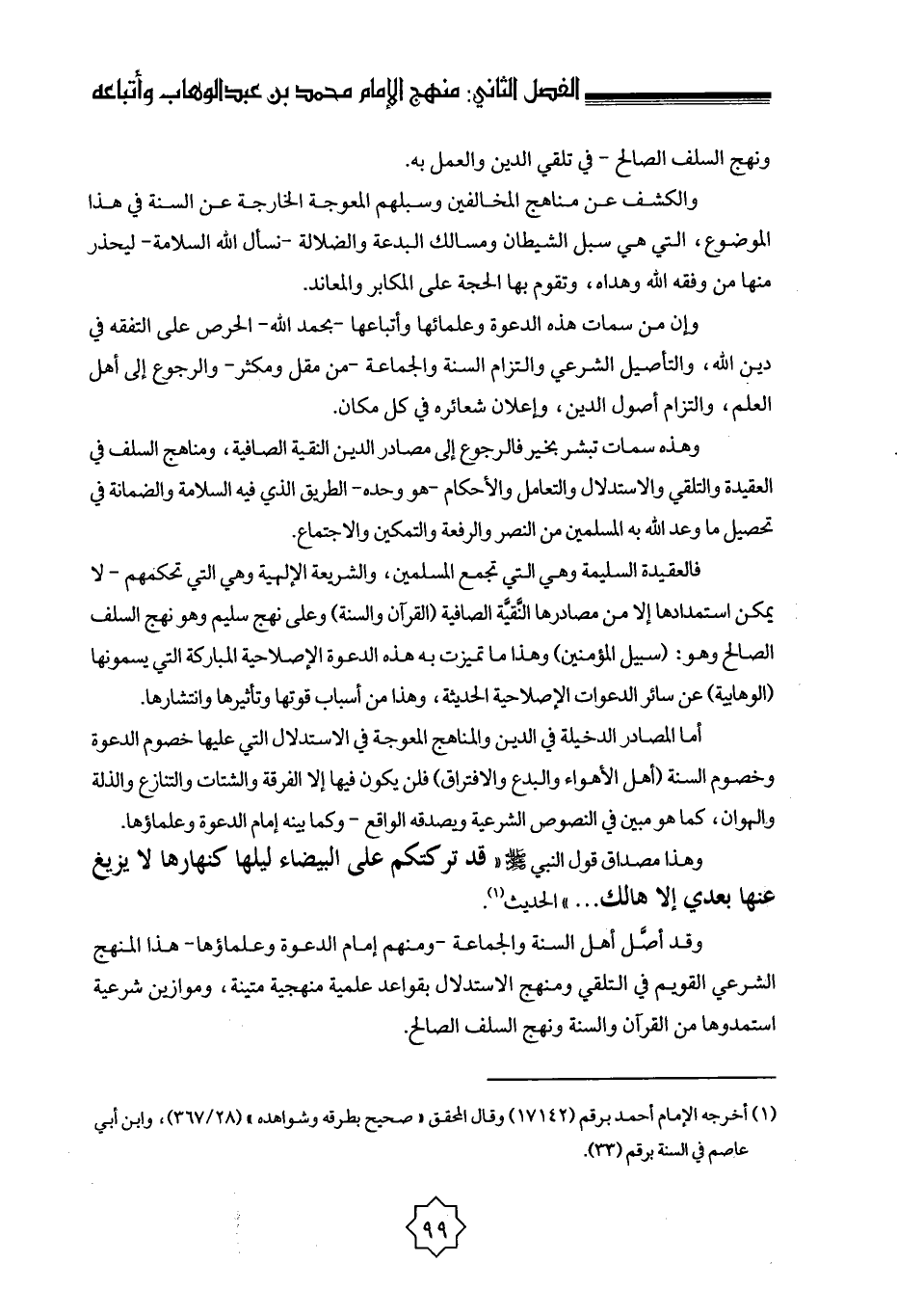 فالعقيدة السليمة وهي التي تجمع المسلمين، والشريعة الإلهية وهي التي تحكمهم - لا يمكن استمدادها إلا من مصادرها النَّقيَّة الصافية (القرآن والسنة) وعلى نهج سليم وهو نهج السلف الصالح وهو: (سبيل المؤمنين) وهذا ما تميزت به هذه الدعوة الإصلاحية المباركة التي يسمونها (الوهابية) عن سائر الدعوات الإصلاحية الحديثة، وهذا من أسباب قوتها وتأثيرها وانتشارها.