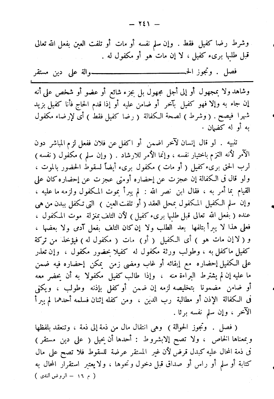 تنبيه. لو قال إنسان لآخر اضمن أو اكفل عن فلان ففعل لزم المباشر دون الآمر لأنه التزم باختيار نفسه، وانما الأمر للارشاد. (وان سلم) مكفول (نفسه) لرب الحق برئ كفيل (أو مات) مكفول برئ أيضا لسقوط الحضور بالموت، ولو قال في الكفالة إن عجزت عن إحضاره أو متى عجزت عن إحضاره كان على القيام بما أمر به، فقال ابن نصر الله: لم يبرأ بموت المكفول ولزمه ما عليه، وان سلم الكفيل المكفول بمحل العقد (أو تلفت العين) التى تكفل ببدن من هى عنده (بفعل الله تعالى قبل طلبها برئ كفيل) لأن التلف بمنزلة موت المكفول، فعلى هذا لا يبرأ بتلفها بعد الطلب ولا إن كان التلف بفعل آدمى ولا بعضها، و (لا إن مات هو) أى الكفيل (أو) مات (مكفول له) فيؤخذ من تركة كفيل ما كفل به، وطولب ورثة مكفول له كفيلا بحضور مكفول، وان تعذر على الكفيل إحضاره مع إبقائه أو غاب ومضى زمن يمكن إحضاره فيه ضمن ما عليه إن لم يشترط البراءة منه، واذا طالب كفيل مكفولا به أن يحضر معه أو ضامن مضمونا بتخليصه لزمه إن ضمن أو كفل باذنه وطولب، ويكفى في الكفالة الاذن أو مطالبة رب الدين، ومن كفله اثنان فسلمه أحدهما لم يبرأ الآخر، وان سلم نفسه برئا
