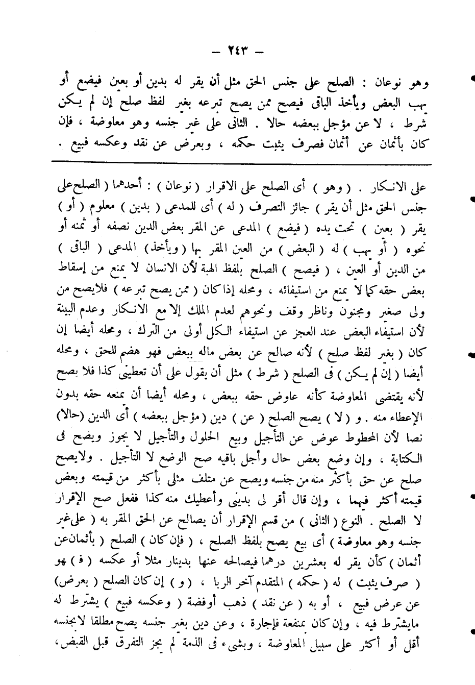 وهو نوعان: الصلح على جنس الحق مثل أن يقر له بدين أو بعين فيضع أو يهب البعض ويأخذ الباقى فيصح ممن يصح تبرعه بغير لفظ صلح إن لم يكن شرط، لا عن مؤجل ببعضه حالا. الثانى على غير جنسه وهو معاوضة، فان كان بأثمان عن أثمان فصرف يثبت حكمه، وبعرض عن نقد وعكسه فبيع.