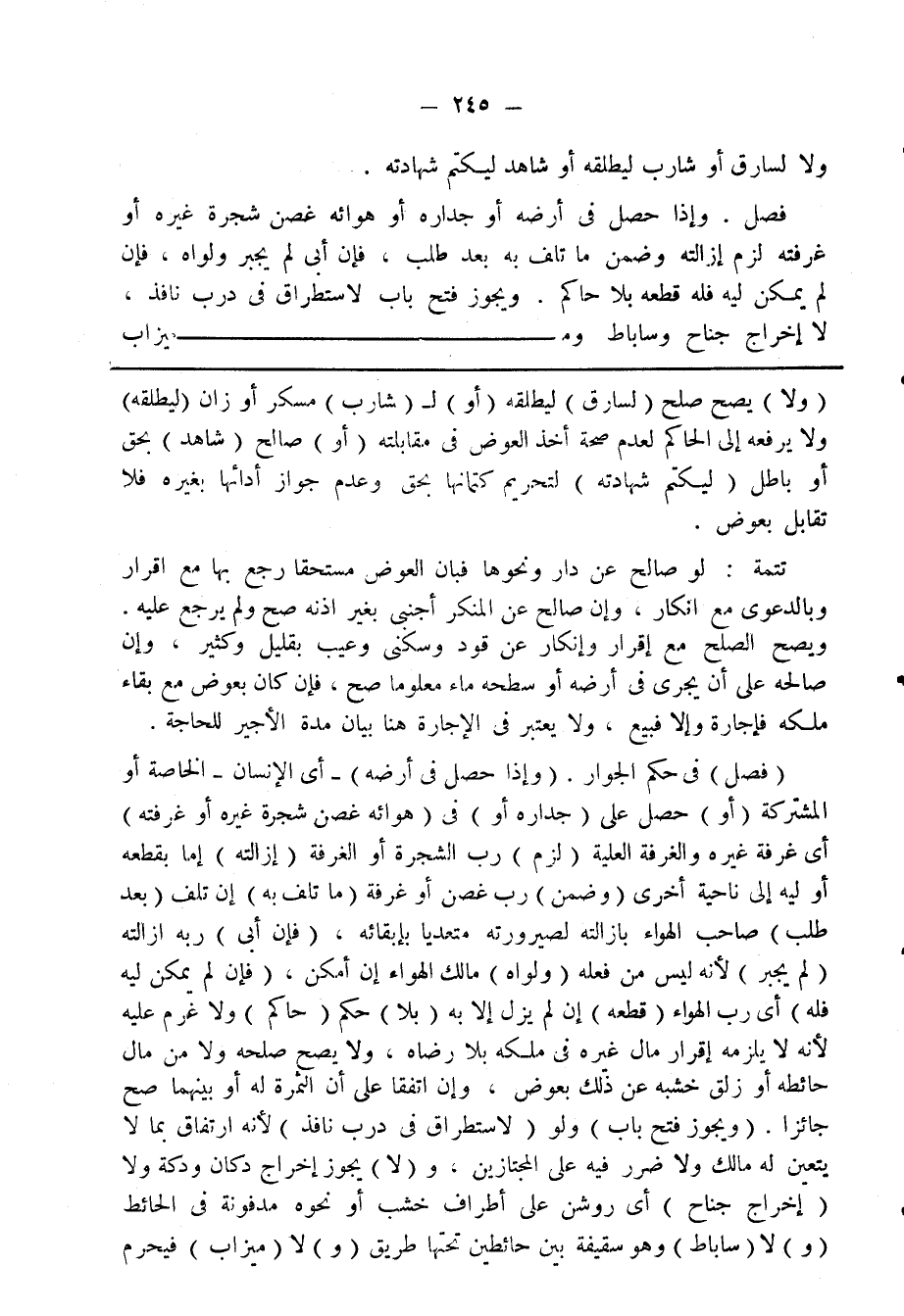 (فصل) فى حكم الجوار. (وإذا حصل فى أرضه) - أي الانسان- الخاصة أو المشتركة (أو) حصل على (جداره أو) في (هوائه غصن شجرة غيره أو غرفته) أى غرفة غيره والغرفة العلية (لزم) رب الشجرة أو الغرفة (إزالته) إما بقطعه أو ليه الى ناحية أخرى (وضمن) رب غصن أو غرفة (ما تلف به) إن تلف (بعد طلب) صاحب الهواء بازالته لصيرورته متعديا بإبقائه، (فان أبى) ربه ازالته (لم يجبر) لانه ليس من فعله (ولواه) مالك الهواء إن أمكن، (فان لم يمكن ليه فله) أى رب الهواء (قطعه) إن لم يزل الا به (بلا) حكم (حاكم) ولا غرم عليه لأنه لا يلزمه إقرار مال غيره فى ملكه بلا رضاه، ولا يصح صلحه ولا من مال حائطه أو زلق خشبه عن ذلك بعوض، وإن اتفقا على أن الثمرة له أو بينهما صح جائزا. _ويجوز فتح باب) ولو (لاستطراق فى درب نافذ) لأانه ارتفاق بما لا يتعين له مالك ولا ضرر فيه على المجتازين، و (لا) يجوز إخراج دكان ودكة ولا (إخراج جناح) أى روشن على أطراف خشب أو نحوه مدفونة فى الحائط (و) لا (ساباط) وهو سقيفة بين حائطين تحتها طريق (و) لا (ميزاب) فيحرم