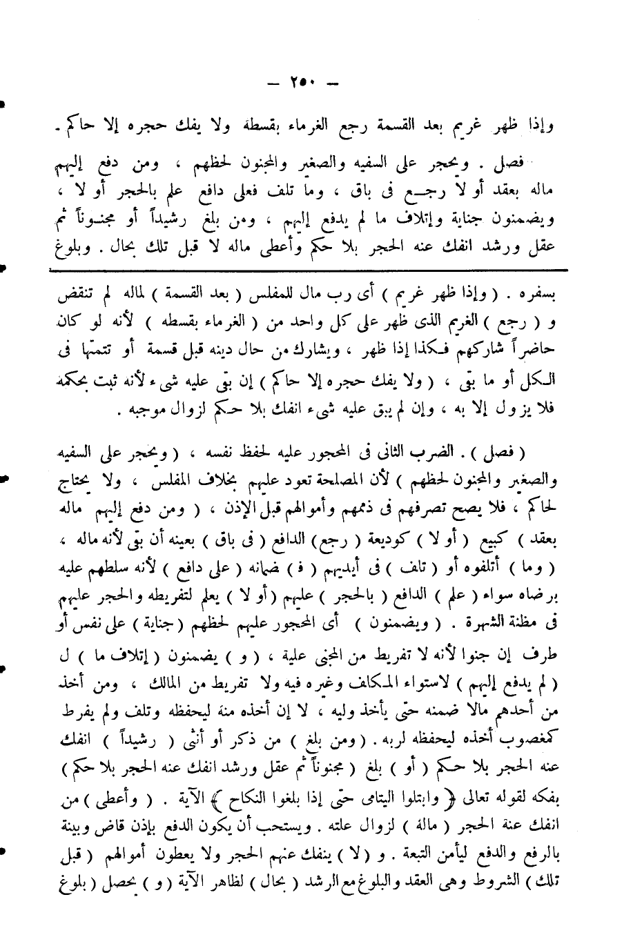 بسفره. (وإذا ظهر غريم) أى رب مال للمفلس (بعد القسمة) لماله لم تنقض و (رجع) الغريم الذى ظهر على كل واحد من (الغرماء بقسطه) لأنه لو كان حاضرا شاركهم فكذا إذا ظهر، ويشارك من حال دينه قبل قسمة أو تتمتها فى الكل أو ما بقى، (ولا يفك حجره الا حاكم) إن بقى عليه شئ لأنه ثبت بحكمه فلا يزول إلا به، وإن لم يبق عليه شئ انفك بلا حكم لزوال موجبه