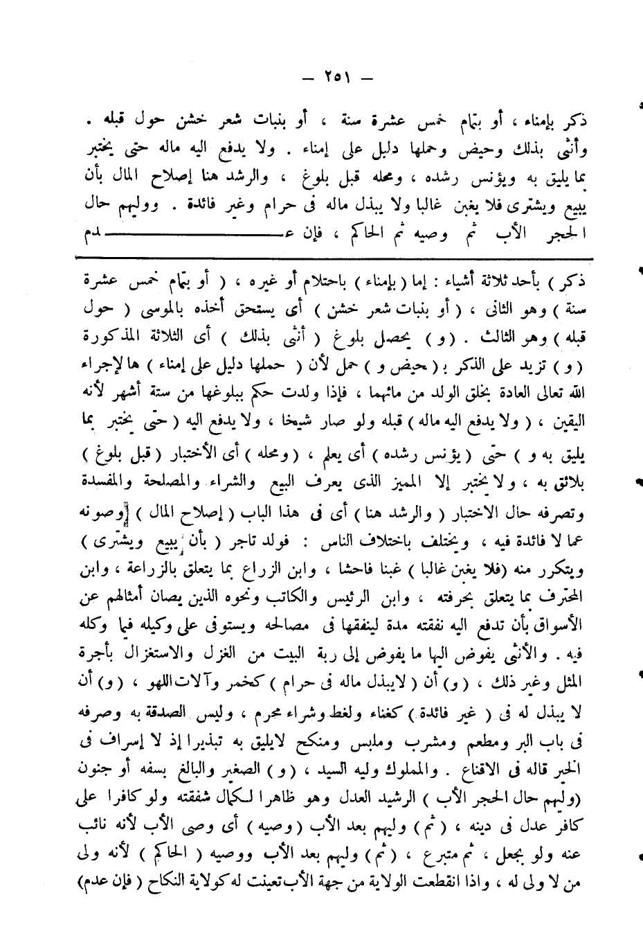 ذكر بإمناء، أو بتمام خمس عشرة سنة، أو بنبات شعر خشن حول قبله. وأنثى بذلك وحيض وحملها دليل على إمناء. ولا يدفع إليه ماله حتى يختبر بما يليق به ويؤنس رشده، ومحله قبل بلوغ، والرشد هنا إصلاح المال بأن يبيع ويشتري فلا يغبن غالبا ولا يبذل ماله في حرام وغير فائدة. ووليهم حال الحجر الأب ثم وصيه ثم الحاكم، فإن عدم