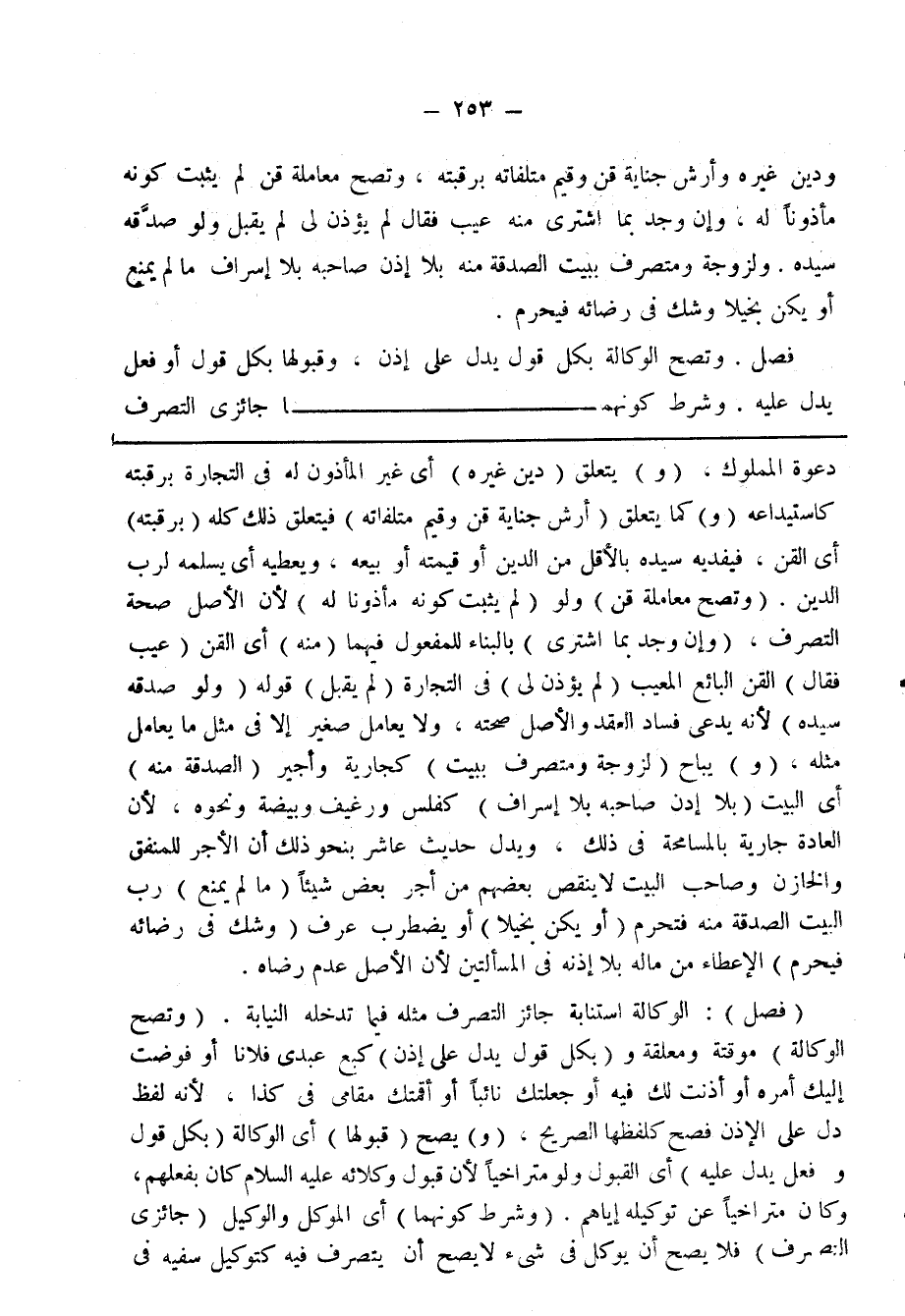 (فصل): الوكالة استنابة جائز التصرف مثله فيما تدخله النيابة. (وتصح الوكالة) مؤقتة ومعلقة و (بكل قول يدل على إذن) كبع عبدي فلانا أو فوضت إليك أمره أو أذن لك فيه أو جعلتك نائبا أو أقمتك مقامي في كذا، لأنه لفظ دل على الإذن فصح كلفظها الصريح، (و) يصح (قبولها) أي الوكالة (بكل قول أو فعل يدل عليه) أي القبول ولو متراخيا لأن قبول وكلائه عليه السلام كان بفعلهم، وكان متراخيا عن توكيله إياهم. (وشرط كونهما) أي الموكل والوكيل (جائزي التصرف) فلا يصح أن يؤكل في شيء لا يصح أن يتصرف فيه كتوكيل سفيه في