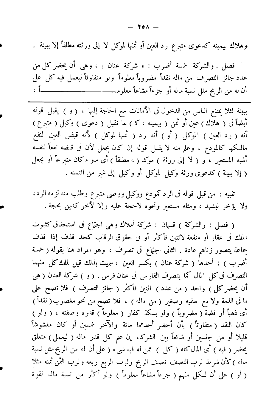 (فصل: والشركة) قسمان: شركة أملاك وهي اجتماع في استحقاق كثبوت الملك في عقار أو منفعة لاثنين فأكثر أو في حقوق الرقاب كحد قذف إذا قذف جماعة يتصور زناهم عادة. الثاني اجتماع في تصرف، وهو المارد هنا بقوله (خمسة أضرب): أحدهما (شركة عنان) بكسر العين، سميت بذلك قيل لملك كل منهما التصرف في كل المال كما يتصرف الفارس في عنان فرس. (و) شركة العنان (هي أن يحضر كل) واحد (من عدد) اثنين فأكثر (جائز التصرف) فلا تصح على ما في الذمة ولا مع سفيه وصغير (من ماله)، فلا تصح من نحو مغصوب (نقدا) أي ذهبا أو فضة (مضروبا) ولو بسكة كفار (معلوما) قدره وصفته، (ولو) كان النقد (متفاوتا) بأن أحضر أحدهما مائة والآخر خمسين أو كان مغشوشا قليلا أو من جنسين أو شائعا بين الشركاء إن علم كل قدر ماله (ليعمل) متعلق يحضر (فيه) أي المال كله (كل) ممن له فيه شيء (على أن له من الربح مثل نسبة ماله) كأن شرط لرب النصف نصف الربح ولرب الربع ربعه ولرب الثمن ثمنه مثلا (أو) على أن لكل منهم (جزءا مشاعا معلوما) ولو أكثر من نسبة ماله لقوة