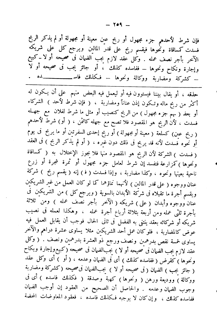 فإن شرط لأحدهم جزء مجهول أو ربح عين معينة أو مجهولة أو لم يذكر الربح فسدت كمساقاة ونحوها فيقسم ربح على قدر المالين ويرجع كل على شريكة الآخر بأجر نصف عمله. وكل عقد لازم يجب الضمان في صحيحه أولا -كبيع وإجارة ونكاح ونحوها- ففاسده كلذلك، أو جائز يجب في صحيحه أو لا -كشركة ومضاربة ووكالة ونحوها- فكذلك فاسده.