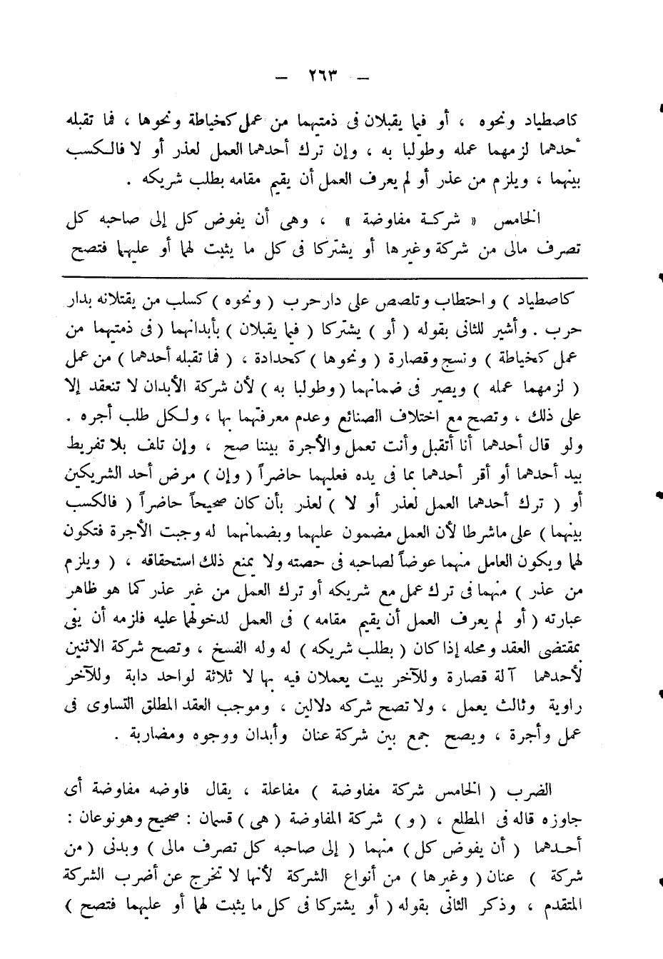 الخامس «شركة مفاوضة»، وهي أن يفوض كل إلى صاحبه كل تصرف مالي من شركة وغيرها أو يشتركا في كل ما يثبت لهما أو عليهما فتصح