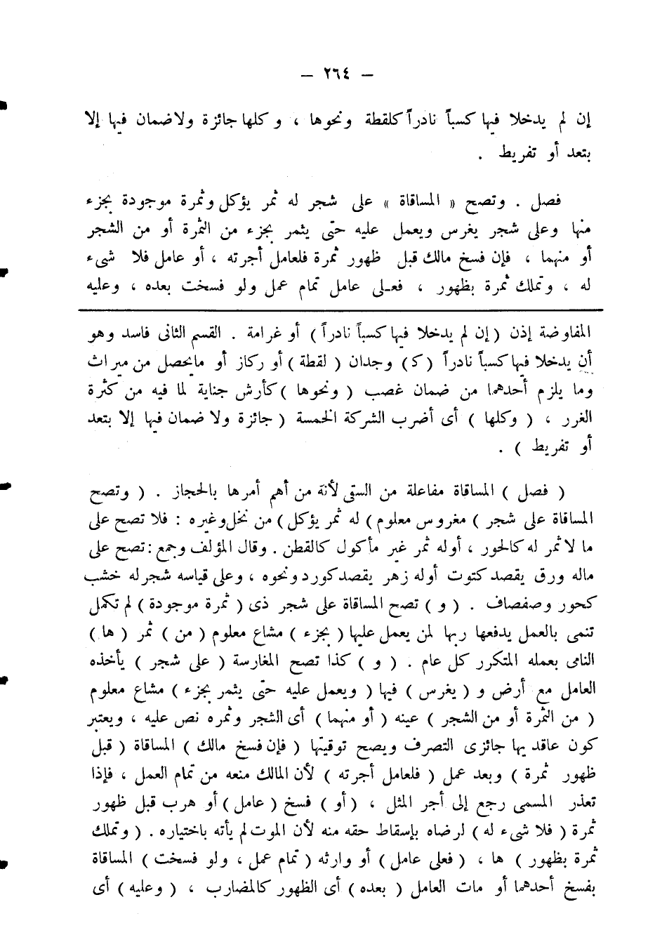 (فصل) المساقاة مفاعلة من السقي لأنه من أهم أمرها بالحجاز. (وتصح المساقاة على الشرج) مغروس معلوم (له ثم يؤكل) من نخل وغيره، فلا تصح على ما لا ثمر له كالحور، أو له ثمر غير مأكول كالقطن. وقال المؤلف وجمع: تصح على ماله ورق يقصد كتوت أو له زهر يقصد كورد ونحوه، وعلى قياسه شجر له خشب كحور وصفصاف. (و) تصح المساقاة على شجر ذي (ثمرة موجودة) لم تكمل تنمى بالعمل يدفعها ربها لمن يعمل عليها (بجزء) مشاع معلوم (من) ثمر (ها) النامي بعمله المتكرر كل عام. (و) كذا تصح المغارسة (على شجر) يأخذه العامل مع أرض و (يغرس) فيها (ويعمل عليه حتى يثمر بجزء) مشاع معلوم (من الثمرة أو من الشجر) عينه (أو منهما) أي الشجر وثمره نص عليه، ويعتبر كون عاقديها جائزي التصرف ويصح توقيتها (فإن فسخ مالك) المساقاة (قبل ظهور ثمرة) وبعد عمل (فلعامل أجرته) لأن المالك منعه من تمام العمل، فإذا تعذر المسمى رجع إلى أجر المثل، (أو) فسخ (عامل) أو هرب قبل ظهور ثمرة (فلا شيء له) لرضاه بإسقاط حقه منه لأن الموت لم يأته بإختياره. (وتملك ثمرة بظهور) ـها، (فعلى عامل) أو وارثه (تمام عمل، ولو فسخت) المساقاة بفسخ أحدهما أو مات العامل (بعده) أي الظهور كالمضارب، (وعليه) أي