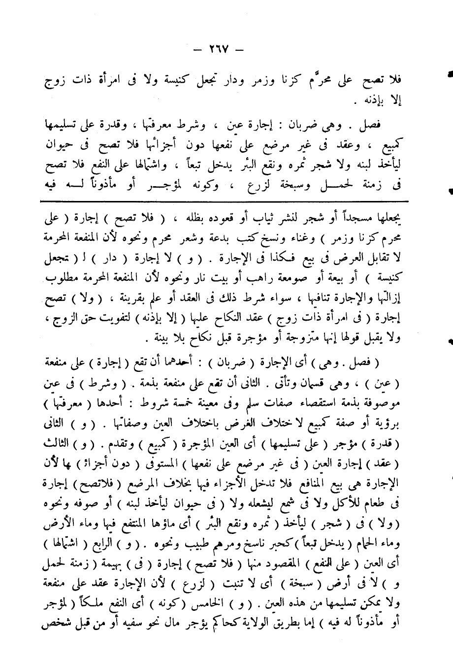 فصل. وهي ضربان: إجارة عين، وشرط معرفتها، وقدرة على تسليمها كمبيع، وعقد في غير مرضع على نفعها دون أجزائها فلا تصح في حيوان ليأخذ لبنه ولا شجر ثمره ونقع البئر يدخل تبعًا، واشتمالها على النفع فلا تصح في زمنة لحمل وسبخة لزرع، وكونه لمؤجر أو مأذونا له فيه