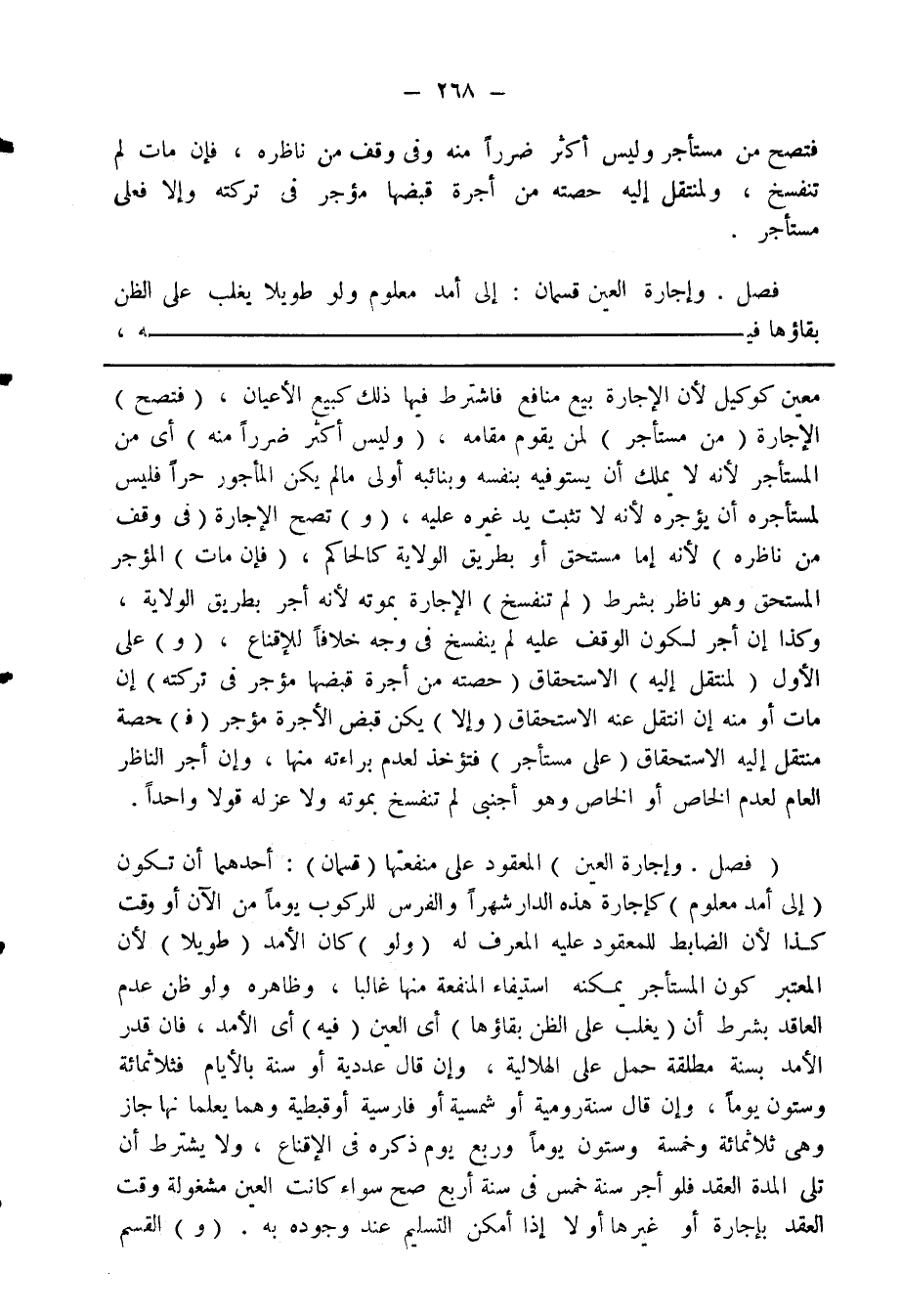 (فصل. وإجارة العين) المعقود على منفعتها (قسمان): أحدهما أن تكون (إلى أمد معلوم) كإجارة هذه الدار شهرا والفرس للركوب يوما من الآن أو وقت كذا لأن الضابط للمعقود عليه المعروف له (ولو) كان الأمد (طويلا) لأن المعتبر كون المستأجر يمكنه استيفاء المنفعة منها غالبا، وظاهره ولو ظن عدم العاقد بشرط أن (يغلب على الظن بقاؤها) أي العين (فيه) أي الأمد، فإن قدر الأمد بسنة مطلقة حمل على الهلالية، وإن قال عددية أو سنة بالأيام فثلاثمائة وستون يوما، وإن قال سنة رومية أو شمسية أو فارسية أو قبطية وهما يعلمانها جاز وهي ثلاثمائة وخمسة وستون يوما وربع يوم ذكره في الإقناع، ولا يشترط أن تلي المدة العقد فلو أجر سنة خمس في سنة أربع صح سواء كانت العين مشغولة وقت العقد بإجارة أو غيرها أو لا إذا أمكن التسليم عند وجوده به. (و) القسم