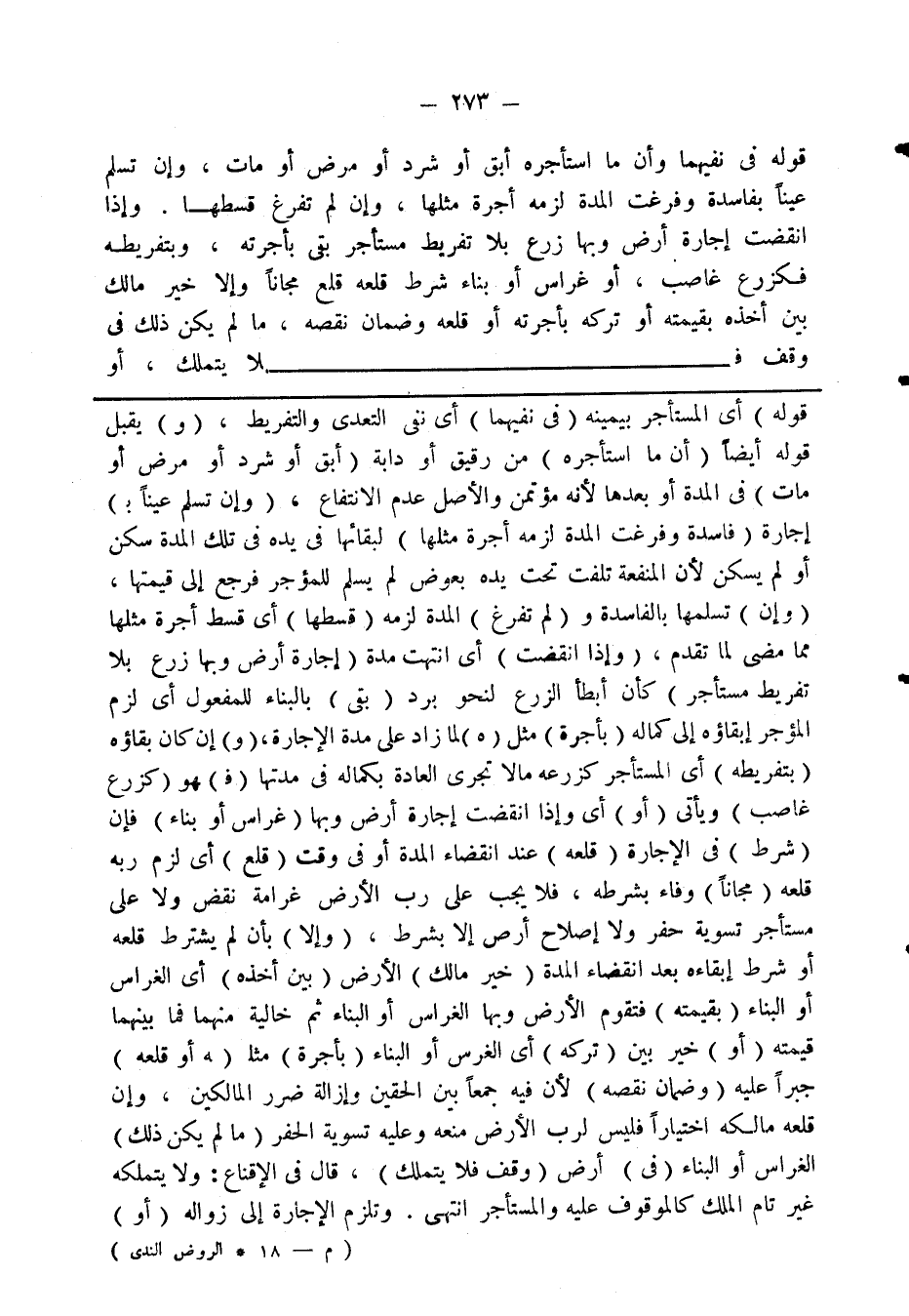 قوله في نفيهما وأن ما استأجره أبق أو شرد أو مرض أو مات، وإن تسلم عينا بفاسدة وفرغت المدة لزمه أجرة مثلها، وإن لم تفرغ قسطها. وإذا انقضت إجارة أرض وبها زرع بلا تفريط مستأجر بقى بأجرته، وبتفريطه فكزرع غاصب، أو غراس أو بناء شرط قلعه قلع مجانا وإلا خير مالك بين أخذه بقيمته أو تركه بأجرته أو قلعه وضمان نقصه، ما لم يكن ذلك في وقف فلا يتملك، أو