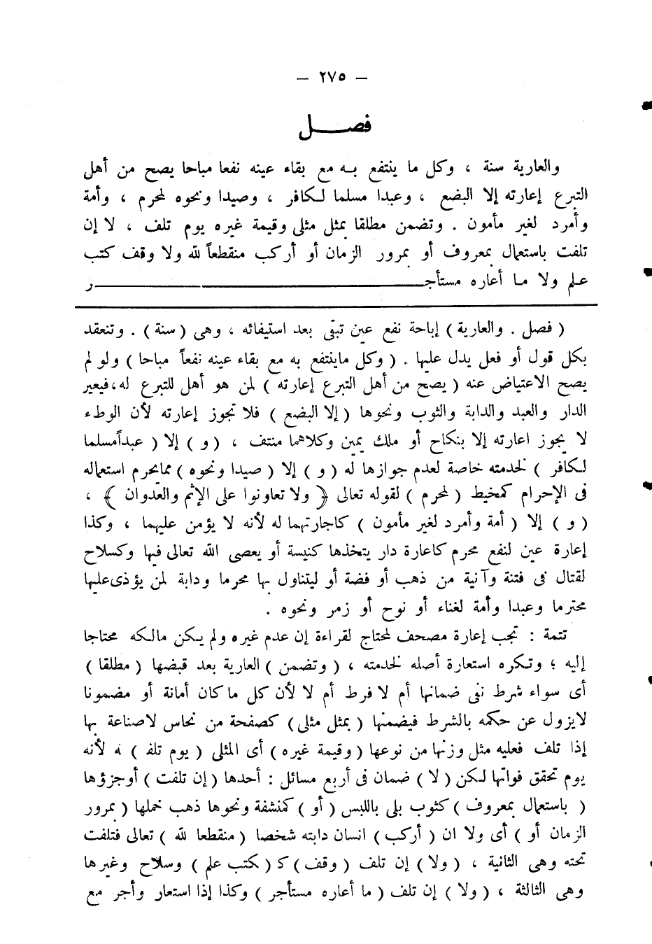 (فصل. والعارية) إباحة نفع عين تبقى بعد استيفائه، وهي (سنة). وتنعقد بكل قول أو فعل يدل عليها. (وكل ما ينتفع به مع بقاء عينه نفعًا مباحا) ولو لم يصح الاعتياض عنه (يصح من أهل التبرع إعارته) لمن هو أهل للتبرع له، فيعير الدار والعبد والدابة والثوب ونحوها (إلا البضع) فلا تجوز إعارته لأن الوطء لا يجوز إعارته إلا بنكاح أو ملك يمين وكلاهما منتف، (و) إلا (عبدًا مسلما لكافر) لخدمته خاصة لعدم جوازها له (و) إلا (صيدا ونحوه) مما يحرم استعماله في الإحرام كمخيط (لمحرم) لقوله تعالى {وَلا تَعَاوَنُوا عَلَى الإِثْمِ وَالْعُدْوَانِ} [المائدة: 2]، (و) إلا (أمة وأمرد لغير مأمون) كإجارتهما له لأنه لا يؤمن عليهما، وكذا إعارة عين لنفع محرم كإعارة دار يتخذها كنيسة أو يعصي الله تعالى فيها وكسلاح لقتال في فتنة وآنية من ذهب أو فضة أو ليتناول بها محرما ودابة لمن يؤذى عليها محترما وعبدا وأمة لغناء أو نوح أو زمر ونحوه