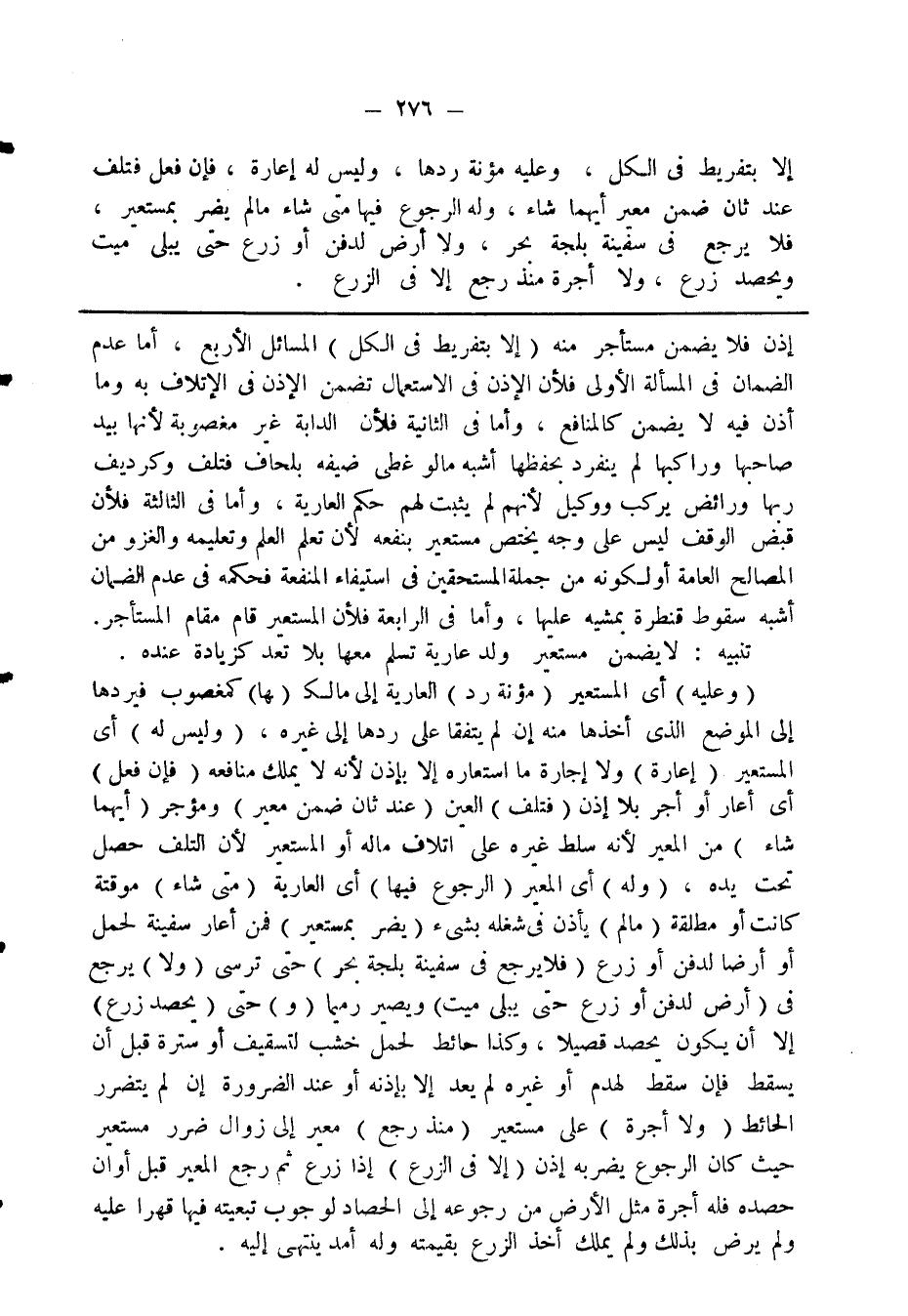(وعليه) أي المستعير (مؤنة رد) العارية إلى مالكـ (ـها) كمغصوب فيردها إلى الموضع الذي أخذها منه إن لم يتفقا على ردها إلى غيره، (وليس له) أي المستعير (إعارة) ولا إجارة ما استعاره إلا بإذن لأنه لا يملك منافعه (فإن فعل) أي أعار أو أجر بلا إذن (فتلف) العين (عند ثان ضمن معير) ومؤجر (أيهما شاء) من المعير لأنه سلط غيره على اتلاف ما له أو المستعير لأن التلف حصل تحت يده، (وله) أي المعير (الرجوع فيها) أي العارية (متى شاء) موقتة كانت أو مطلقة (ما لم) يأذن في شغله بشيء (يضر بمستعير) فمن أعار سفينة لحمل أو أرضا لدفن أو زرع (فلا يرجع في سفينة بلجة بحر) حتى ترسى (ولا) يرجع في (أرض لدفن أو زرع حتى يبلى ميت) ويصير رميما (و) حتى (يحصد زرع) إلا أن يكون يحصد قصيلا، وكذا حائط لحمل خشب لتسقيف أو سترة قبل أن يسقط فإن سقط لهدم أو غيره لم يعد إلا بإذنه أو عند الضرورة إن لم يتضرر الحائط (ولا أجرة) على مستعير (منذ رجع) معير إلى زوال ضرر مستعير حيث كان الرجوع يضربه إذن (إلا في الزرع) إذا زرع ثم رجع المعير قبل أوان حصده فله أجره مثل الأرض من رجوعه إلى الحصاد لوجول تبعيته فيها قهرا عليه ولم يرض بذلك ولم يملك أخذ الزرع بقيمته وله أمد ينتهي إليه